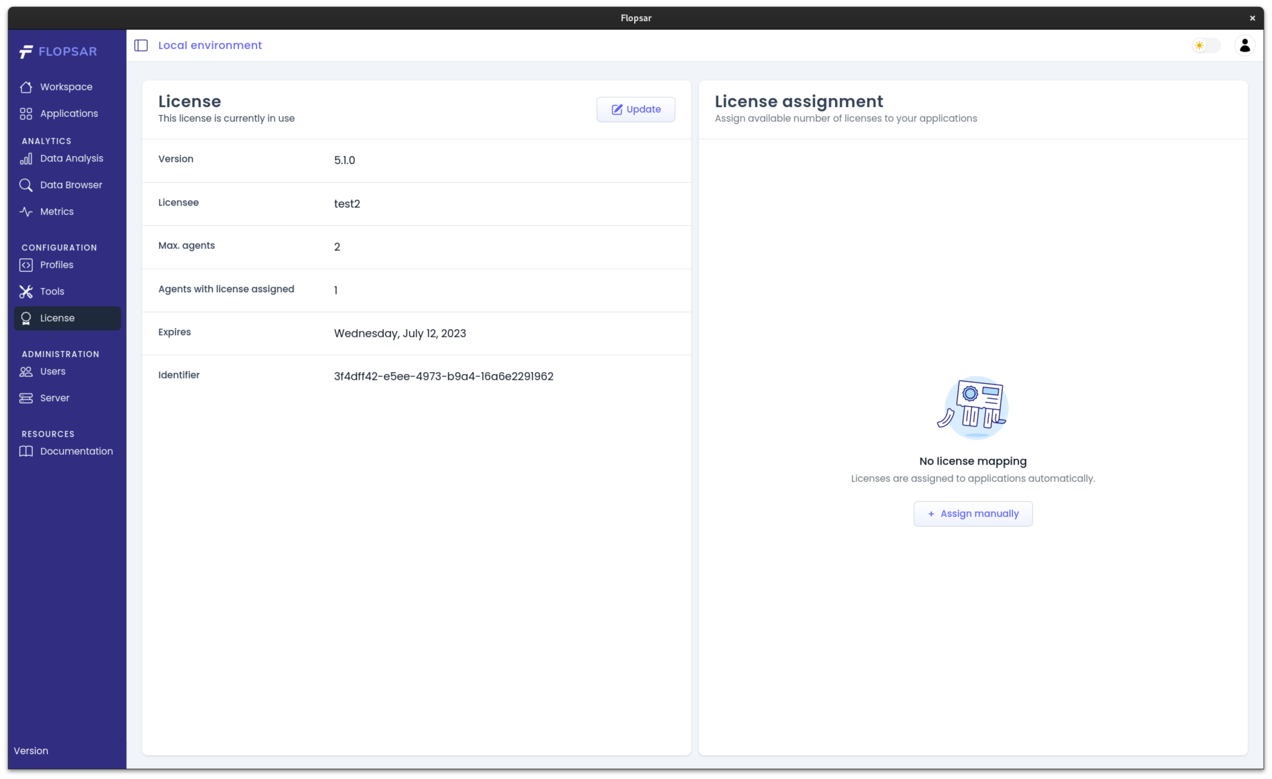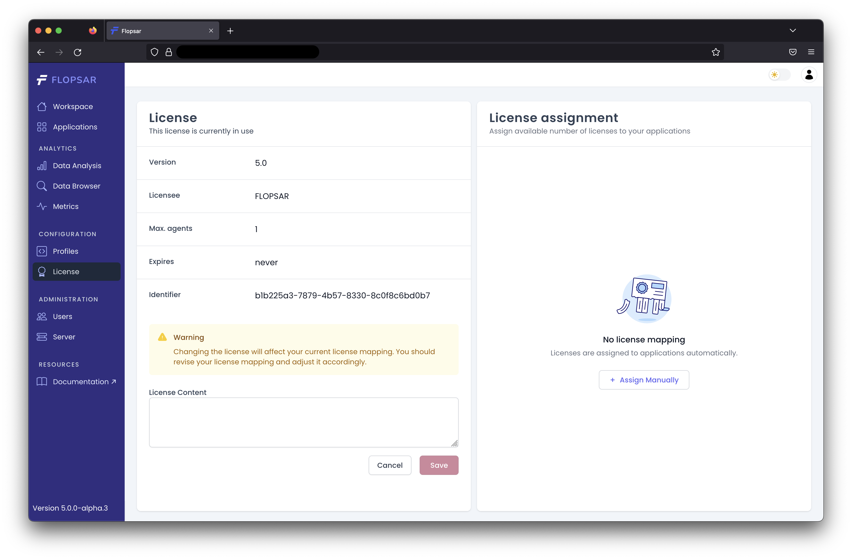 When you do not have a license, you can still run the Flopsar environment with some limitations, i.e. you can collect data only from a single agent. If you want to collect data from multiple agents, you will need a valid license. This license must be uploaded to the server. You can do this from the License page.