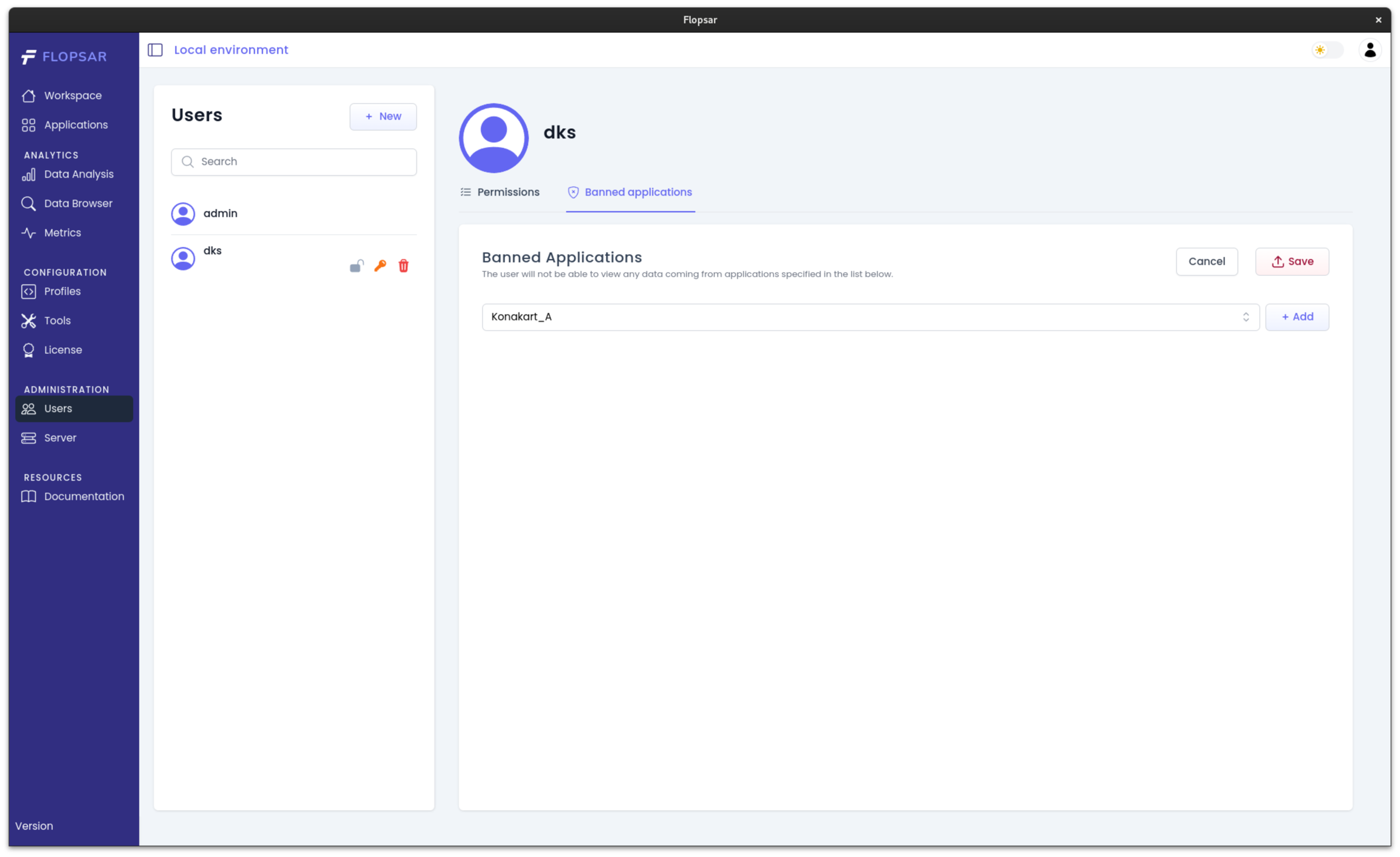 If you do not want a user to see data from particular applications, you can do this by banning the applications for that specific user. In order to edit the banned applications list click the Banned applications tab.