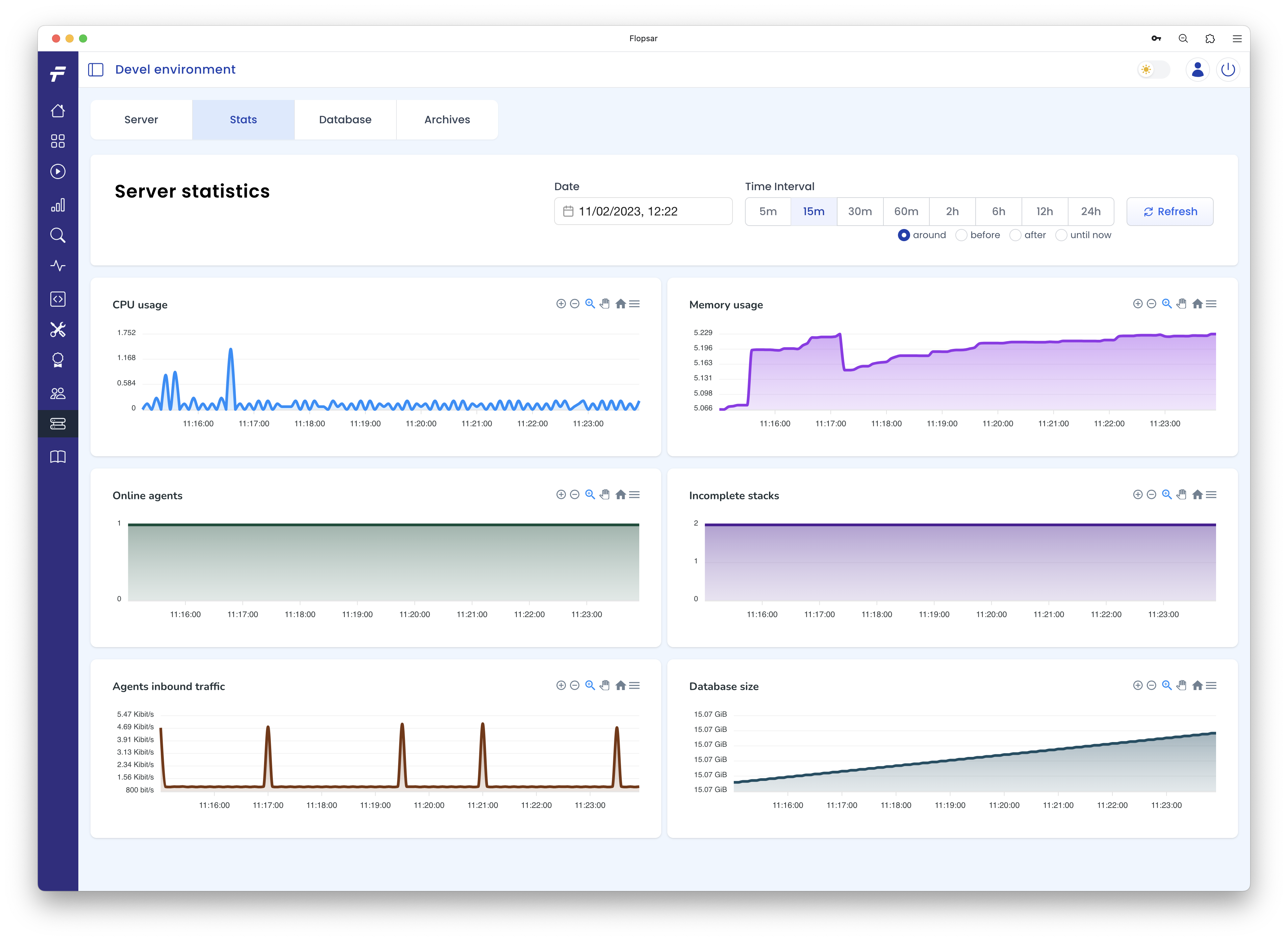 There are six metrics available. The <mark style="color:purple;">`Online agents`</mark> graph presents how many agents were connected to the server simultaneously. The <mark style="color:purple;">`Incomplete stacks`</mark> graph presents how many [method executions stacks](https://docs.flopsar.com/5.2/user-guide/glossary#execution-stack) were being collected in the server internal collector. The <mark style="color:purple;">`Agents inbound traffic`</mark> graph shows the data transfer rate received from all the connected agents. The <mark style="color:purple;">`Database size`</mark> graph shows how much disk space is used for all the collected data.