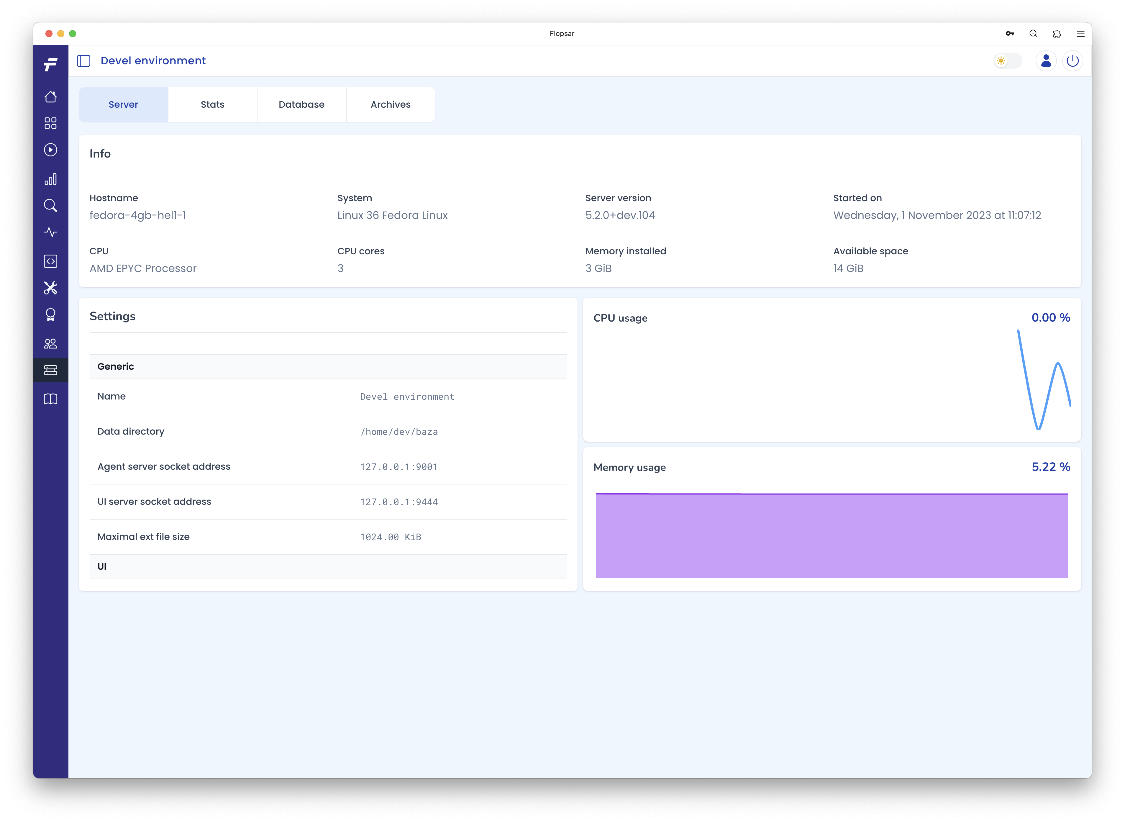 The <mark style="color:purple;">`Settings`</mark> section displays the contents of the server [settings configuration file](https://docs.flopsar.com/5.2/administrator-guide/server/..#configuration). The <mark style="color:purple;">`CPU usage`</mark> shows the current server process CPU usage. The <mark style="color:purple;">`Memory usage`</mark> shows the current server memory usage.