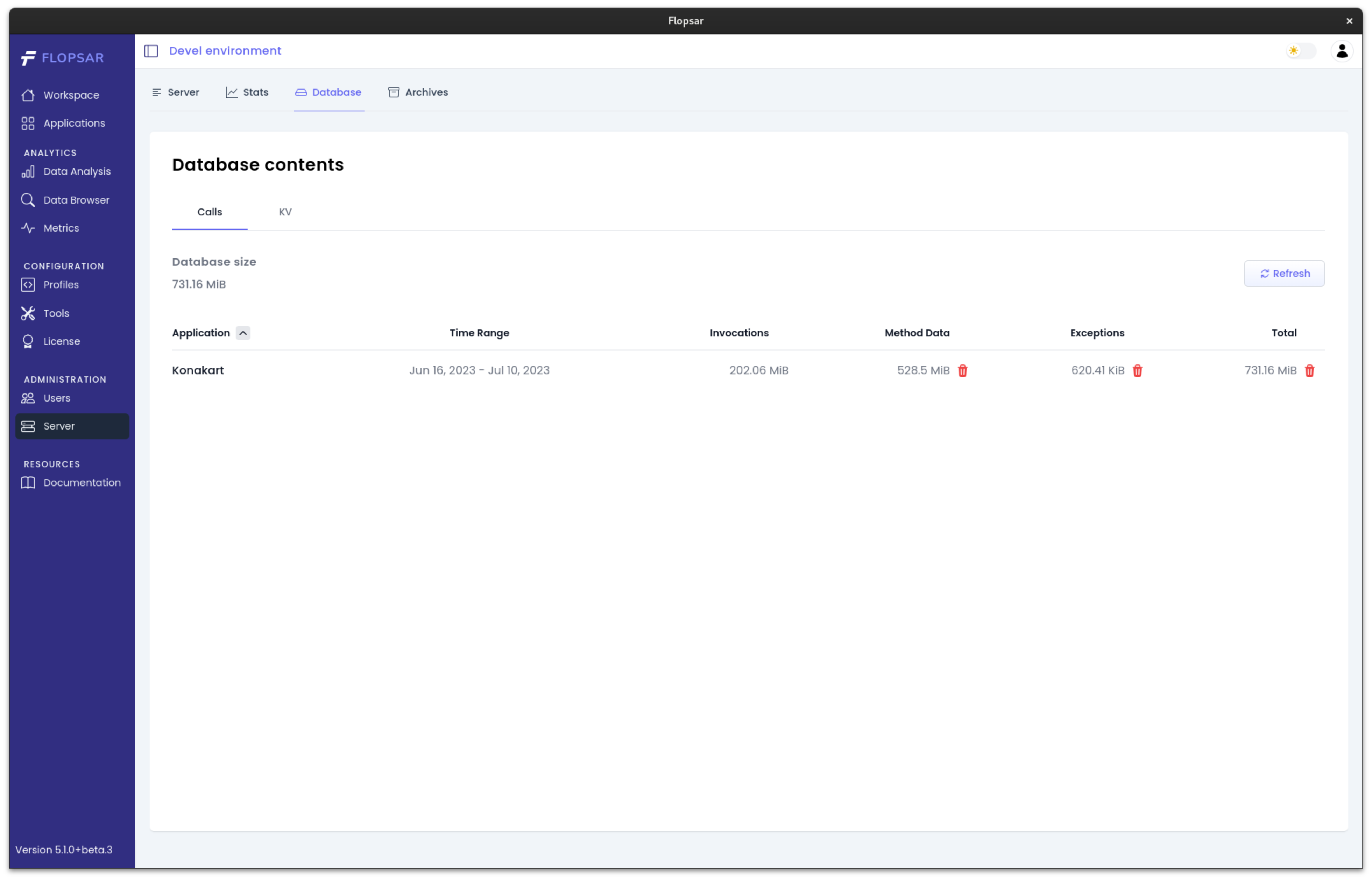 This view is a more fine-grained view of the data. It shows which application's data takes disk space most. The data are classified in logical groups. The <mark style="color:purple;">`Method Data`</mark> group contains methods' parameters and can be safely deleted if you are not interested in them. The <mark style="color:purple;">`Exceptions`</mark> group contains only exceptions stack traces and can also by safely deleted. You can also delete all data of the selected application by clicking the trash icon in the <mark style="color:purple;">`Total`</mark> column.&#x20;