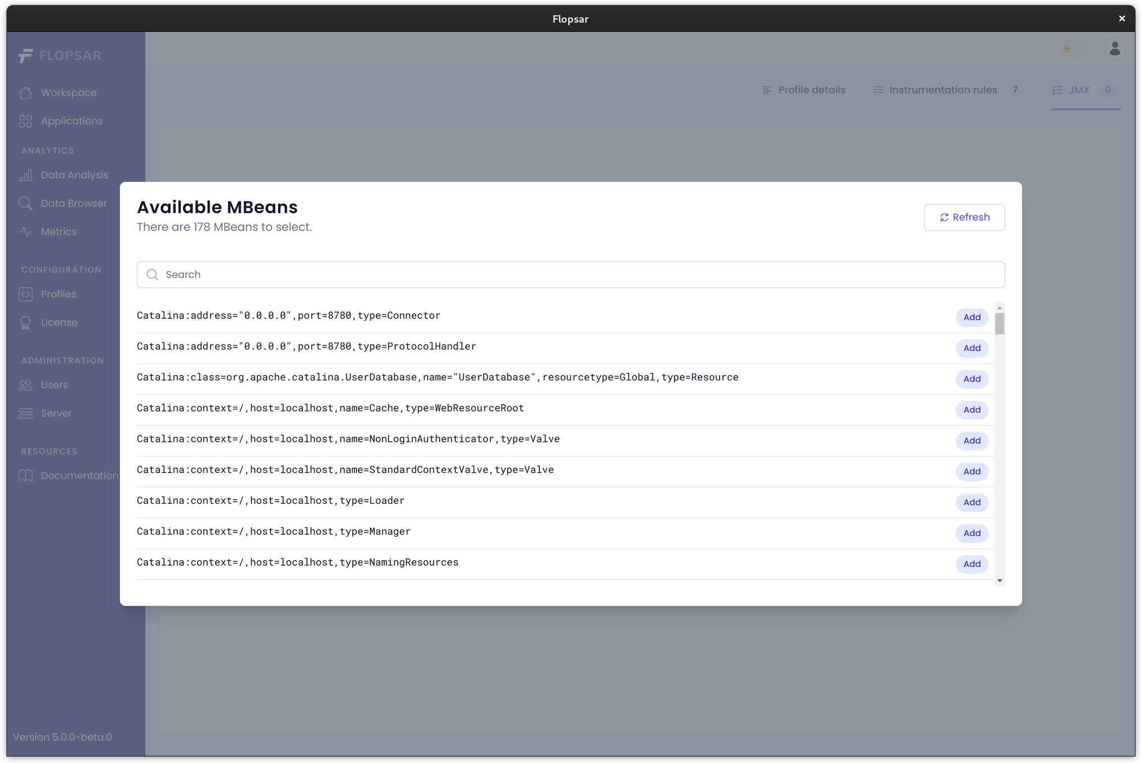 button for any MBean you want to select. When you are done with adding the MBeans either click outside the popup window or press the Escape