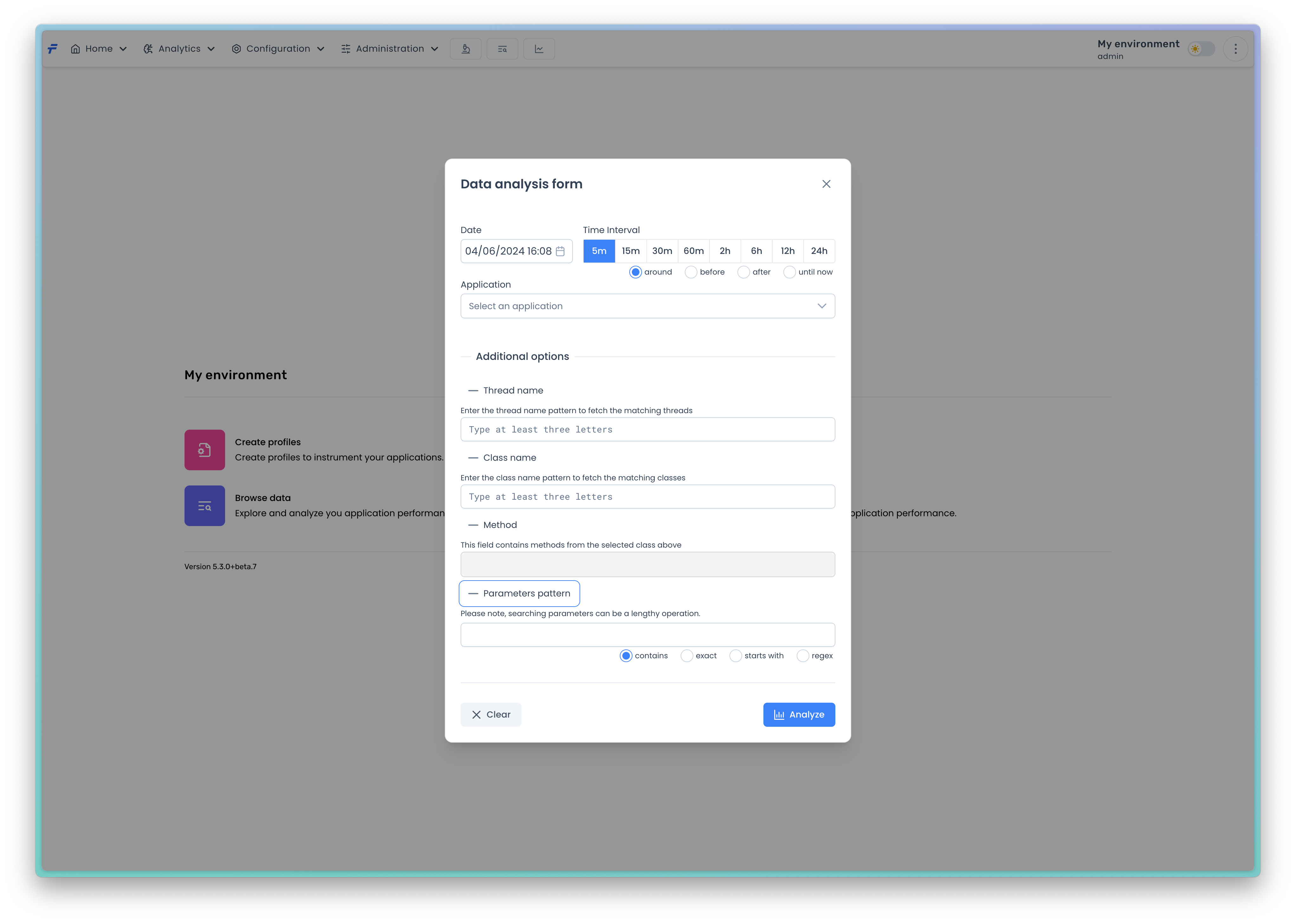 This view is useful when you want to analyze your collected method invocations. There are only two fields that need to be fill out. You must specify both the date range and the application. Then, the analysis will be performed for those method invocations which ended within the specified time range and came from the specified application.