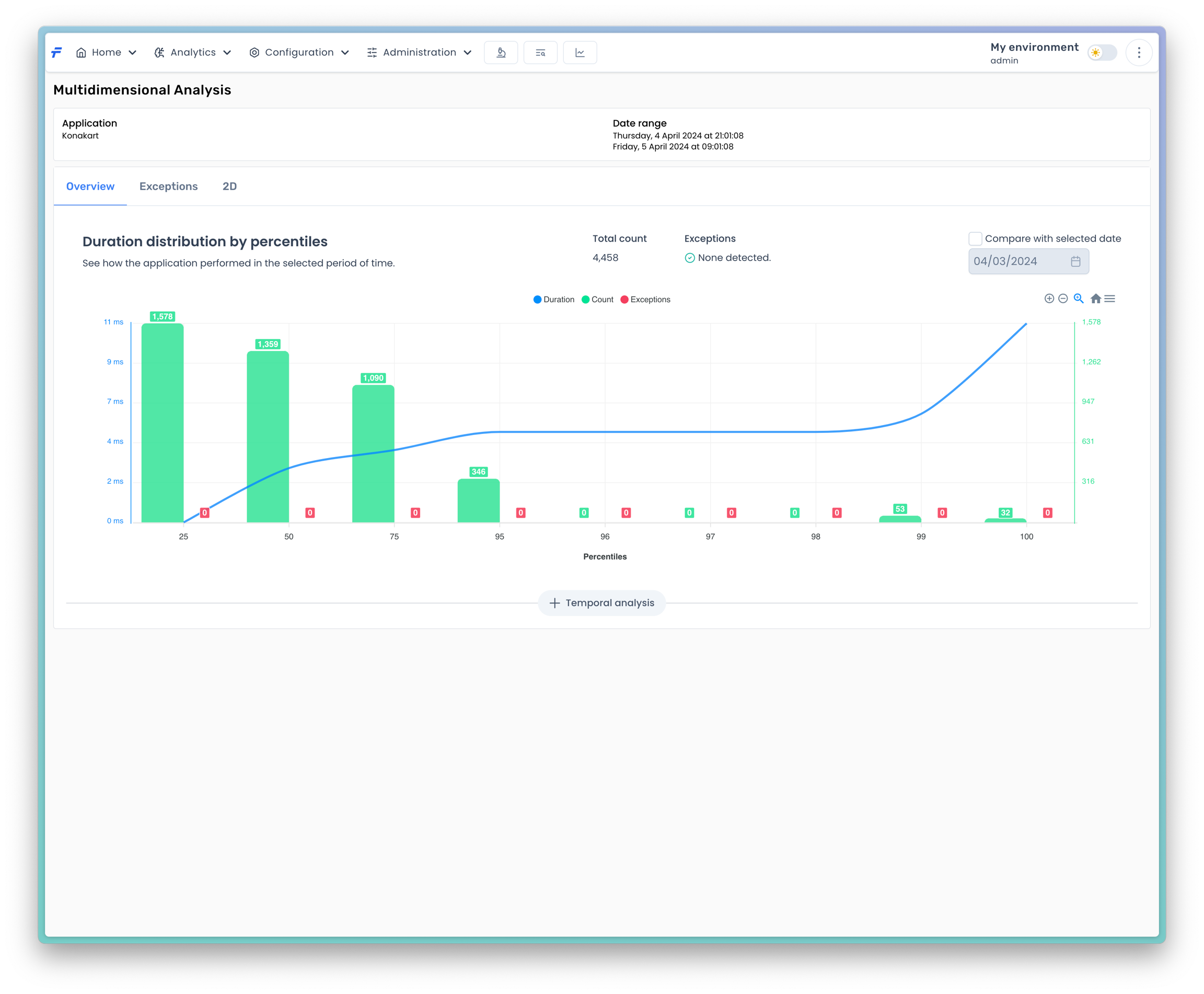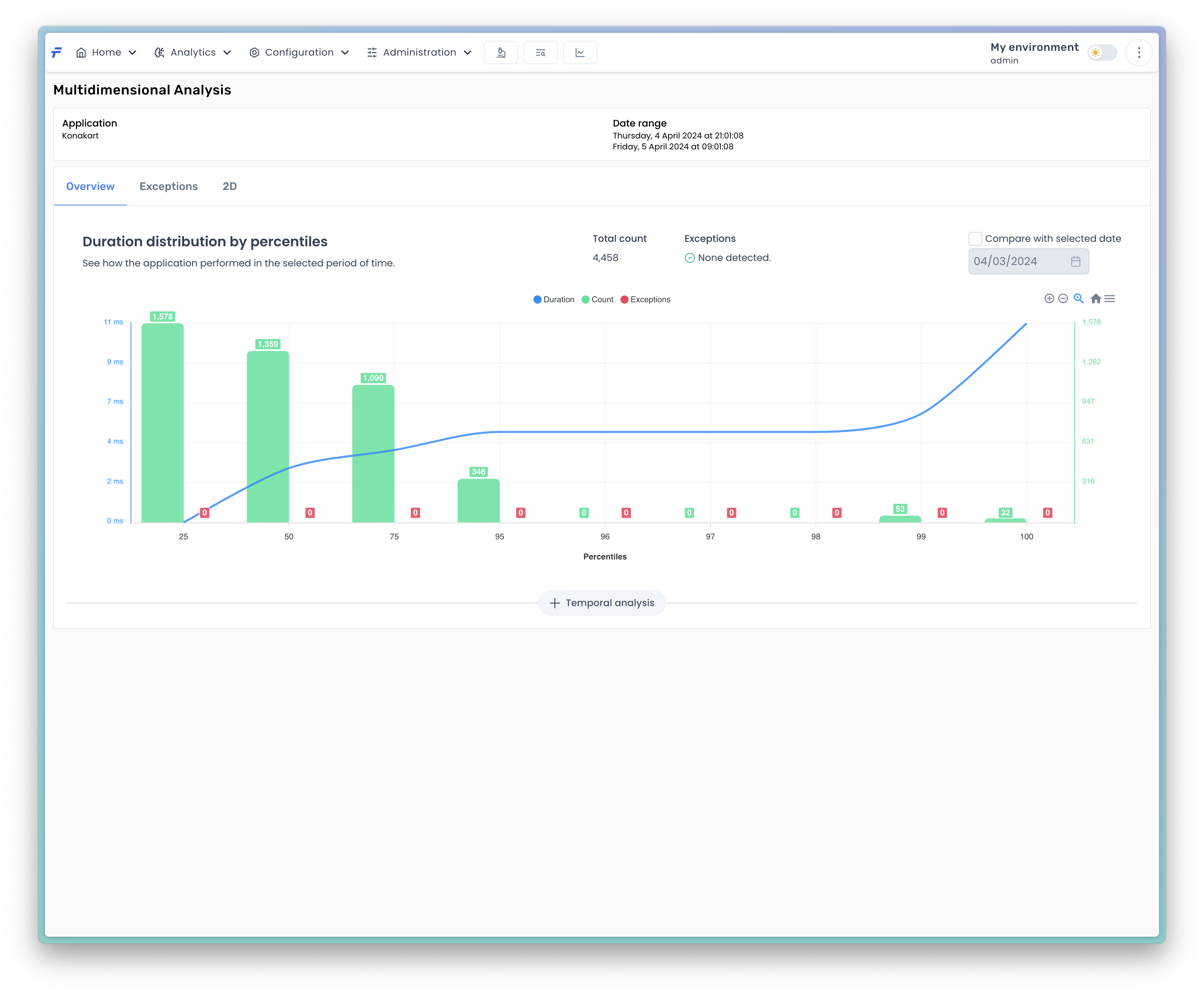 It is easy to see, in the sample case, that the number of methods invocations decreases rapidly as percentile grows. There are only a few outliers, whose duration is above a minute. It is up to a user whether a further analysis is required or not. If a more detailed investigation is needed a user can proceed with the analysis by pressing the Temporal analysis button.