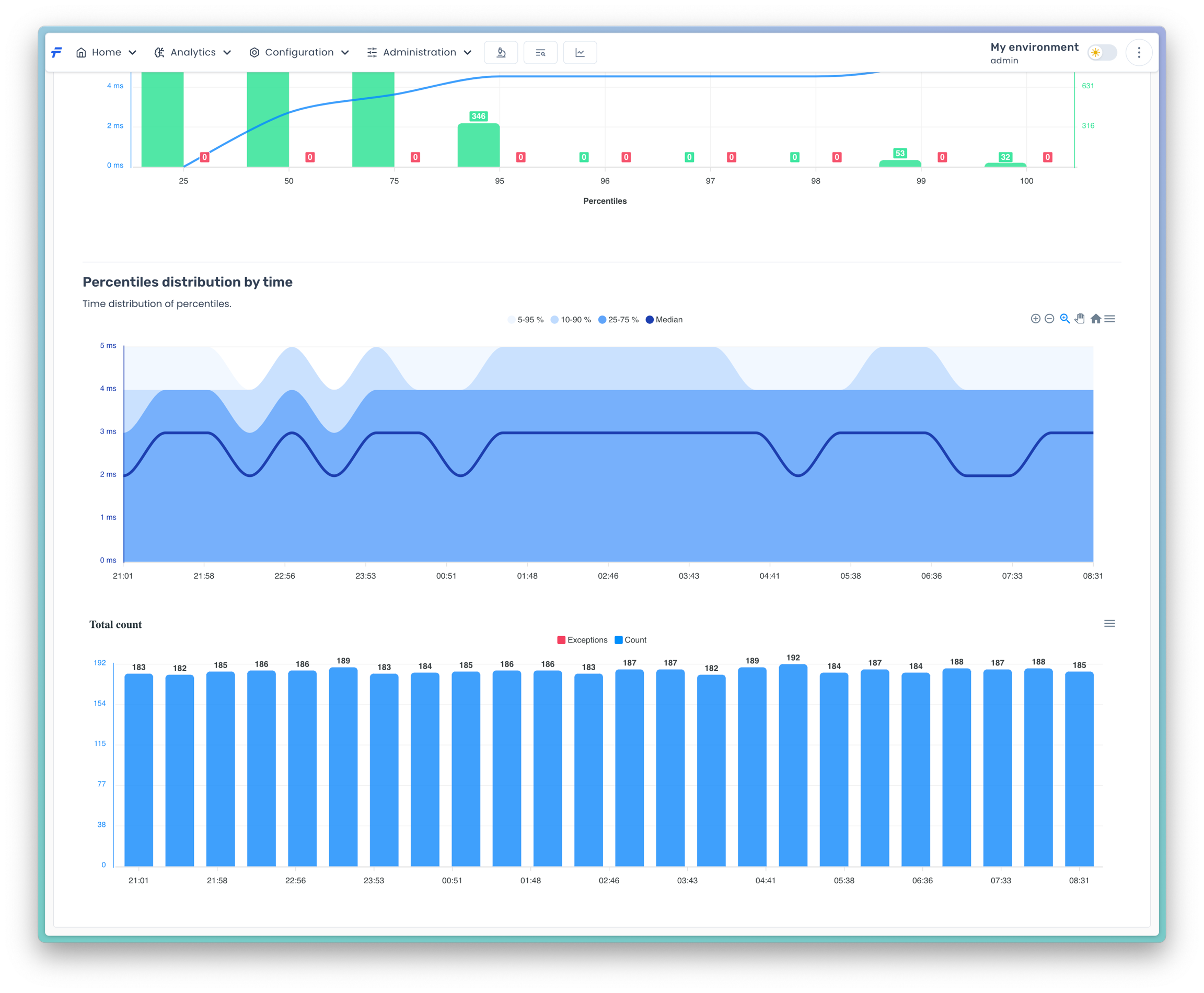 This part of the analysis presents how the percentile values change in time for the specified period. There are two tabs with the results. The first one Values presents how the percentile values change in time. Just like in the duration distribution there are bars and curves. The bars represent the amounts of invocations in time periods. The curves present the percentile values of duration. There are four percentiles curves that can be displayed simultaneously, i.e. 25th, 50th, 75th and 9*th. The last one is customizable and can be changed in the Highest percentile option.
