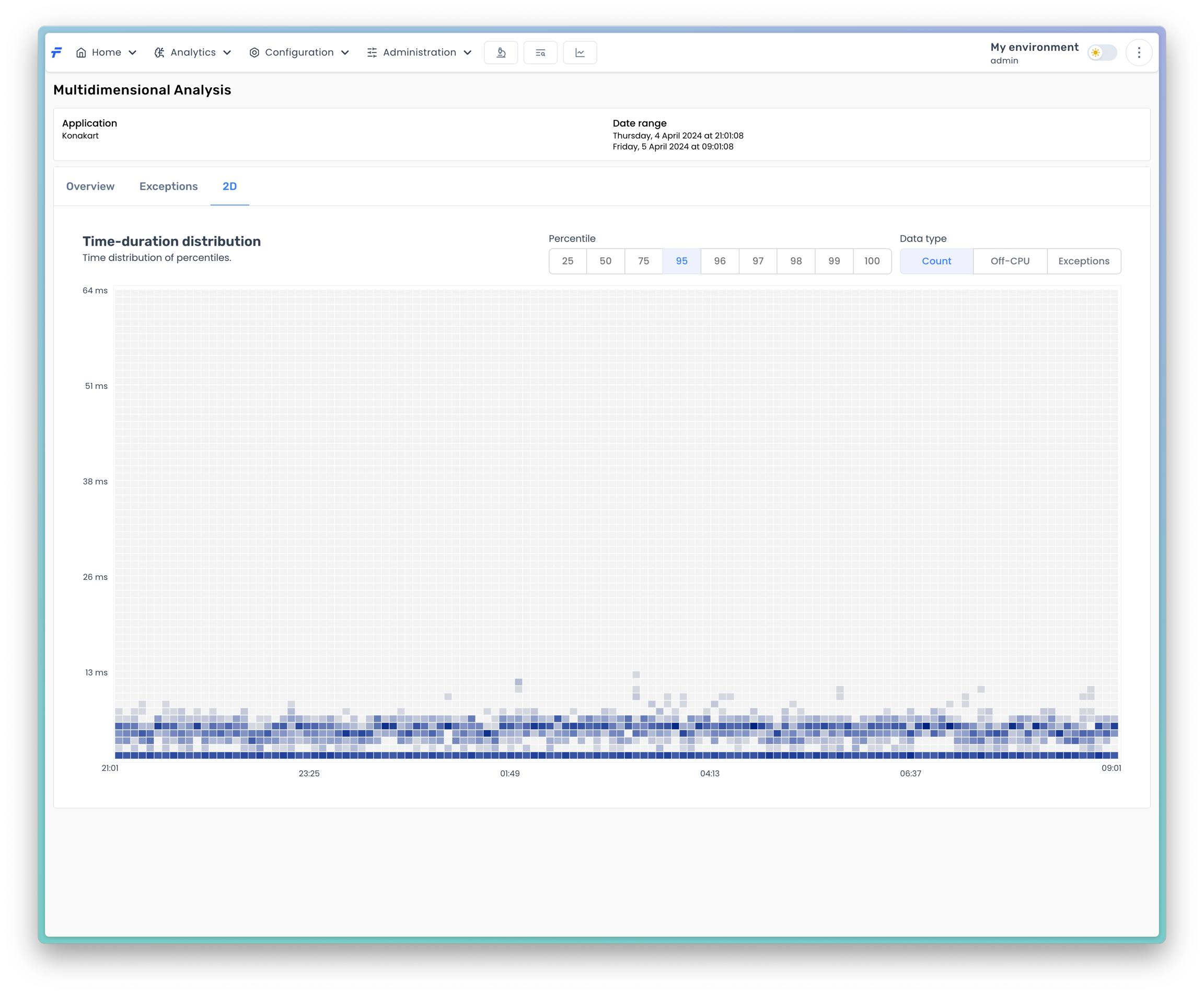 The 2D analysis is represented in a form of a heatmap chart. The chart presents a distribution of one of the selected Data type with respect to both duration (vertical axis) and time (horizontal axis). The chart is divided into cells, which aggregate data for particular ranges of duration and time. For Count data type, each cell represents a number of invocations within the cell range. For Off-Cpu data type, each cell represents a percentage of method invocations, whose off-cpu time is the largest. For Exceptions data type, each cell represents a number of methods that throw exceptions.
