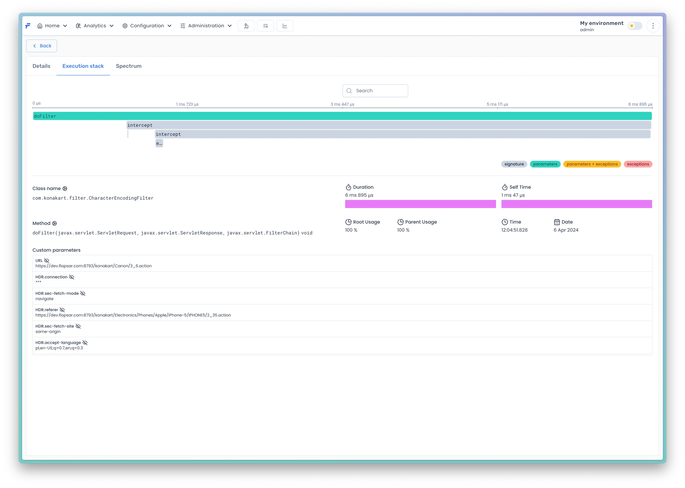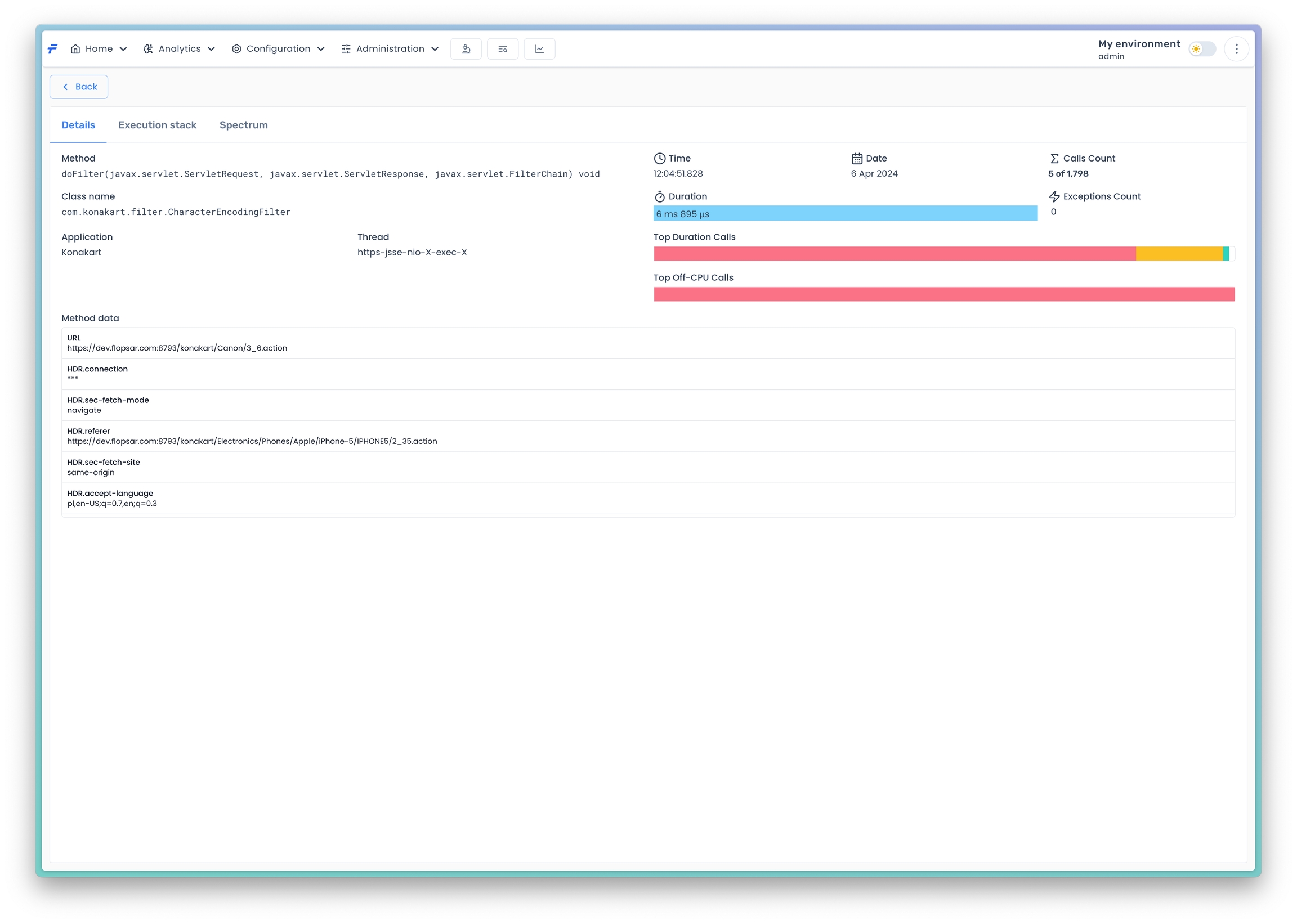 The method execution stack is depicted as an inverted stack, where a root call is located at the top and all consequent invocations are placed on each other. Each bar in the stack denotes a single method invocation. The width of the bar denotes the method duration and it is scaled relative to the root call bar width. The time flows from left to right, hence the order of bars on the same level matters. Each bar has one of four background colors. If an invocation has no additional data, its background is grey. If the invocation have only parameters its background is green. If it has only an exception its background is red then. It if has both an exception and parameters its background is orange.