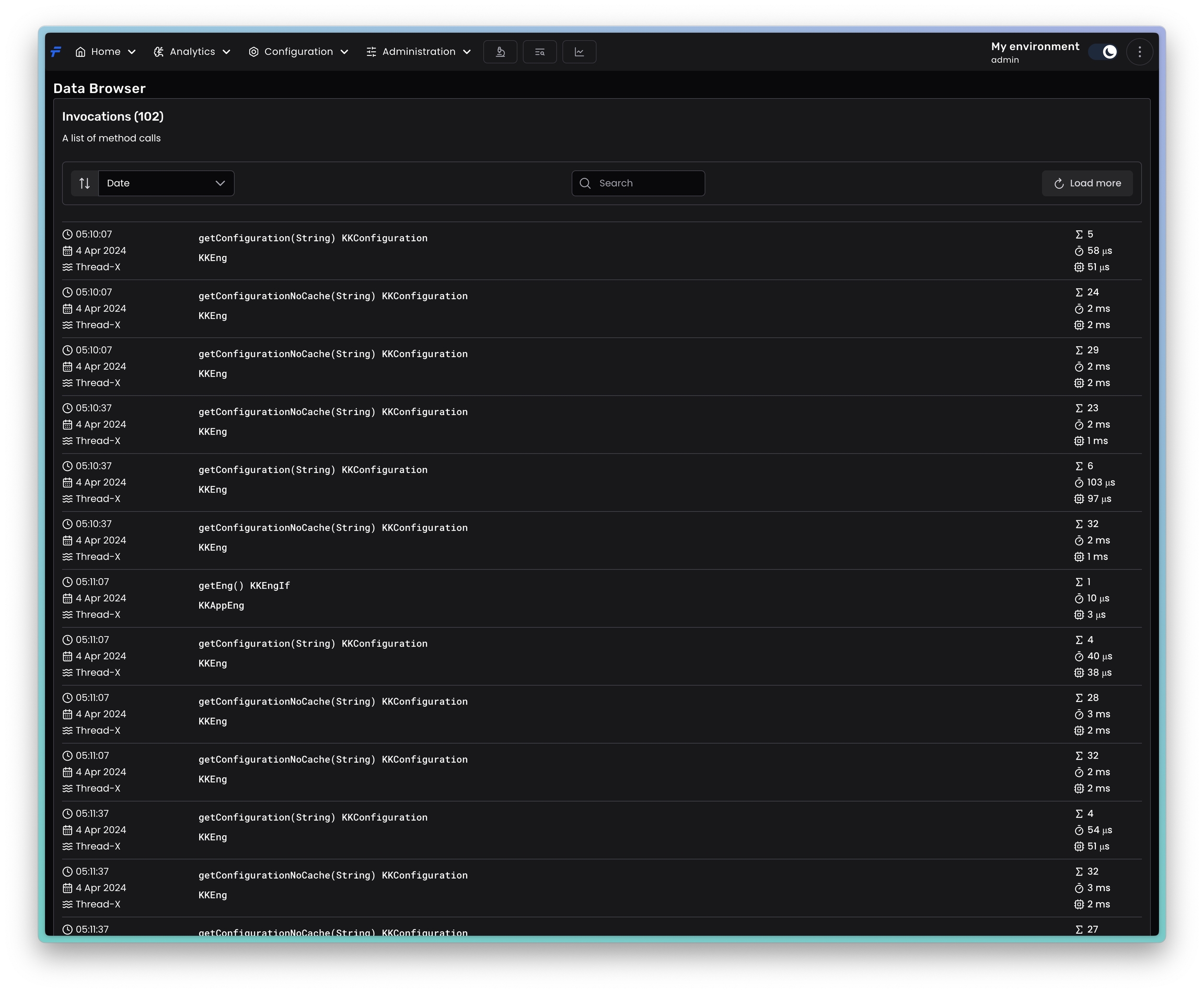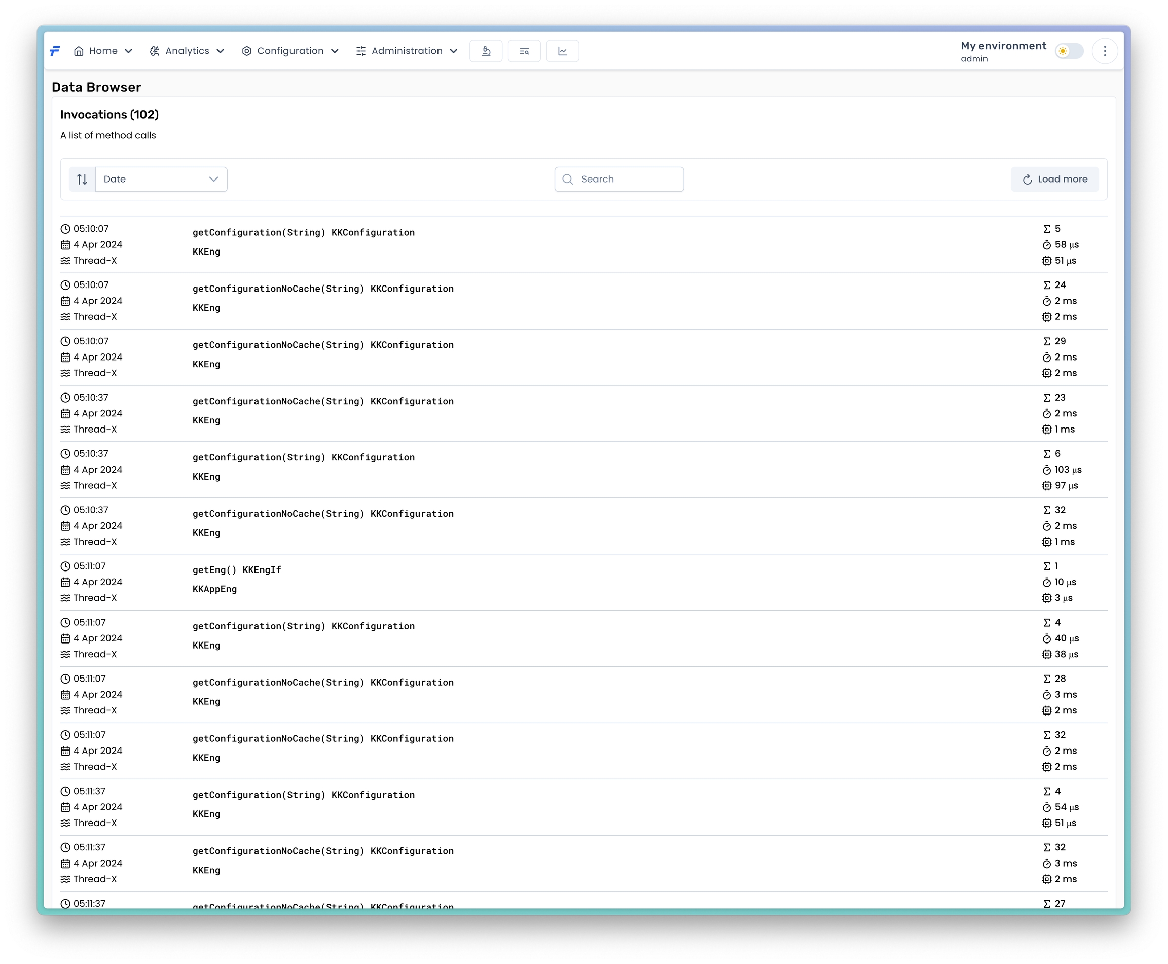 The search results are presented in a form of a list. Each list record presents a single method invocation. If you want to see more details about the selected method invocation, just click the method signature and you will get details of the execution stack this method is a member of.