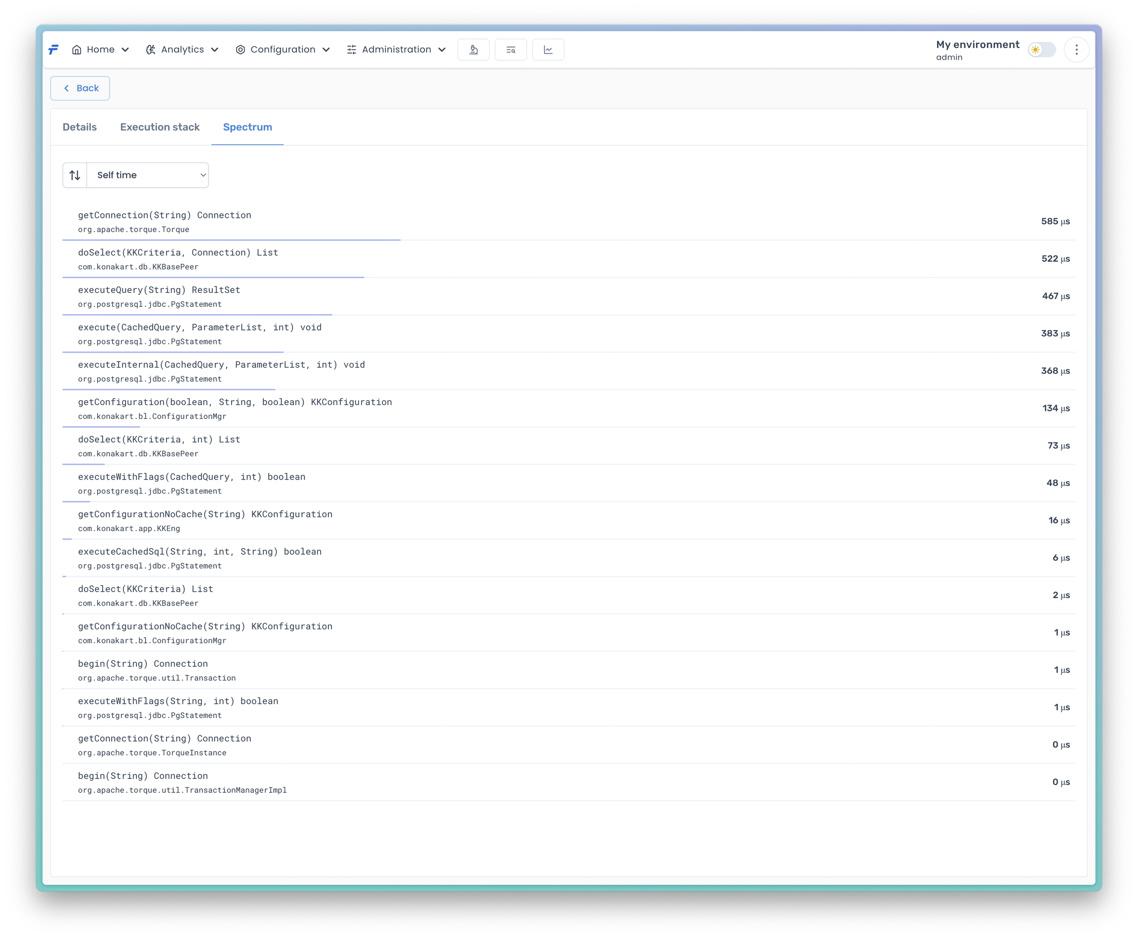 This view presents a list of all methods called within the execution stack. The methods are aggregated and sorted. You can sort them with respect to one of the three criteria: self time, calls count and exceptions count.
