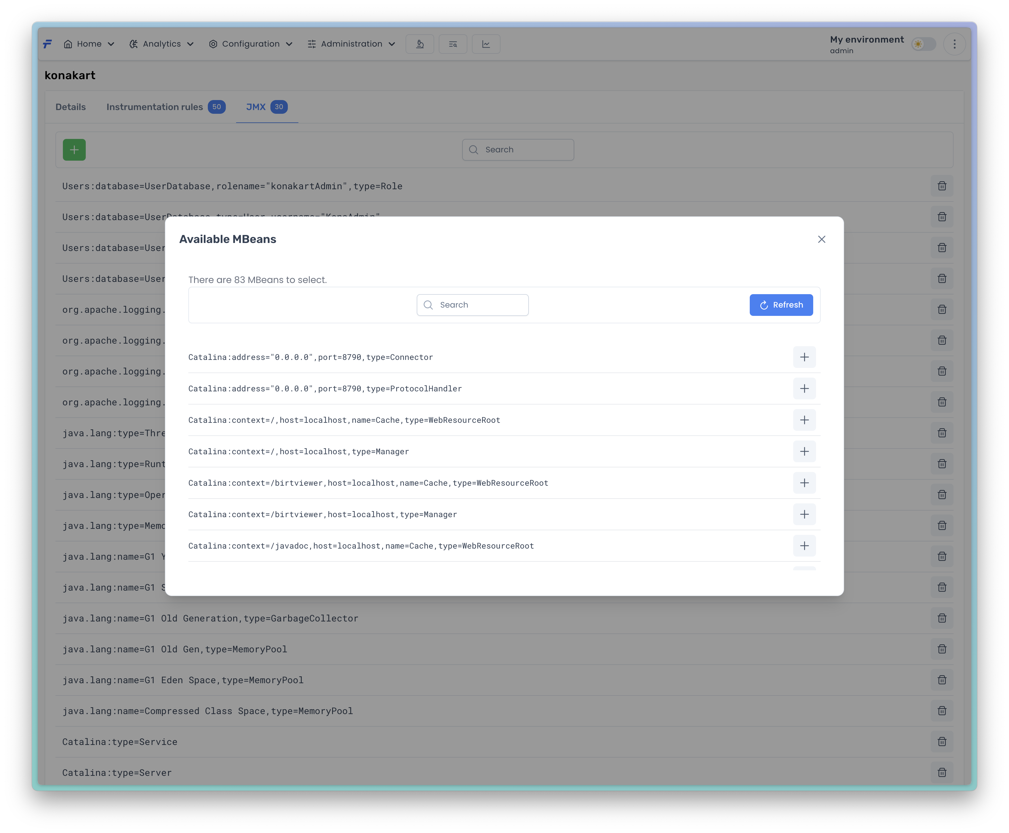 Now, you can press the <mark style="color:blue;">`Add`</mark> button for any MBean you want to select. When you are done with adding the MBeans either click outside the popup window or press the **`Escape`** button to close the popup window.&#x20;