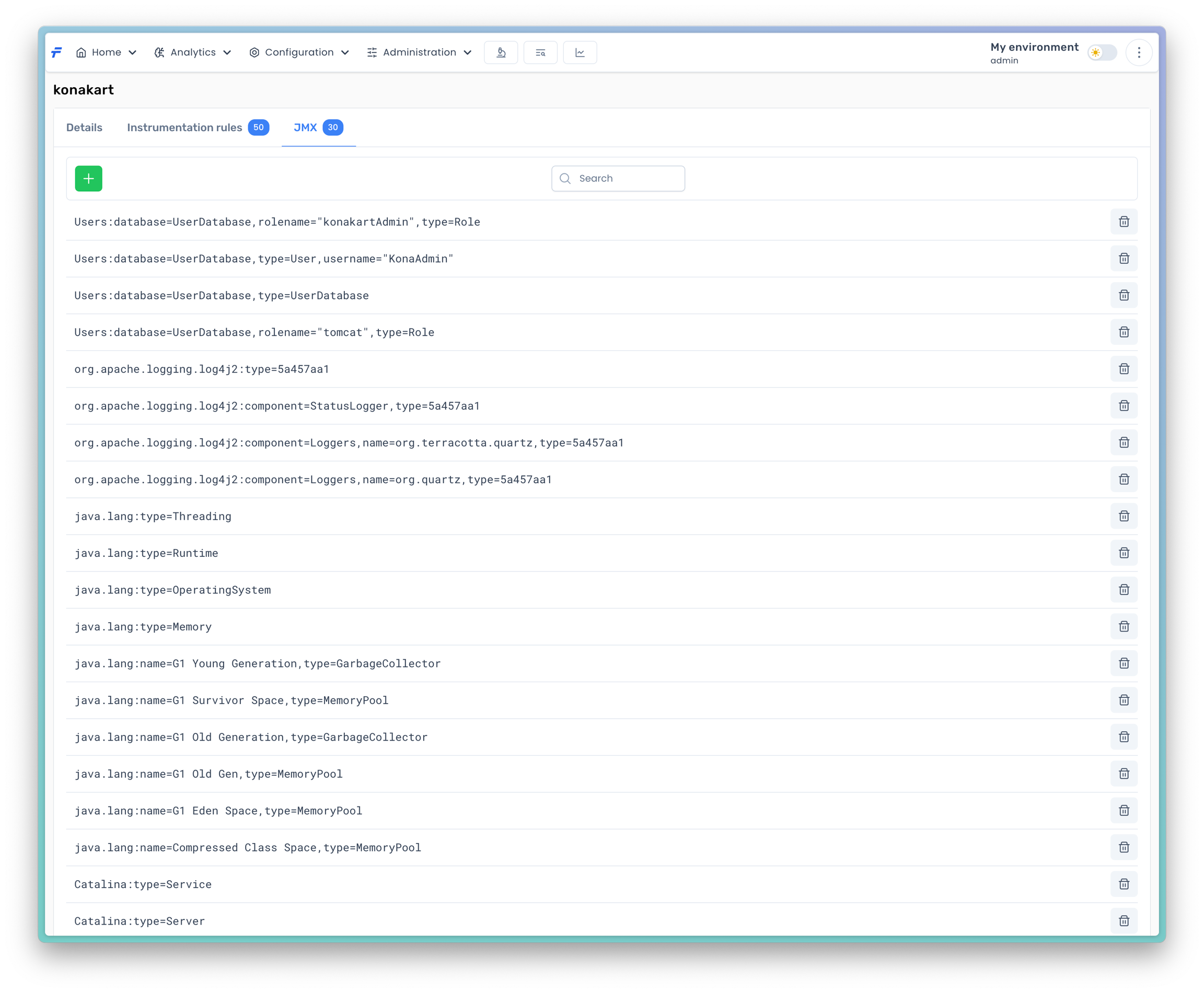 This view enables specifying which MBeans values you want to collect. To add MBeans, you need to retrieve them from agents first. You can do this by pressing the Add ObjectNames button.