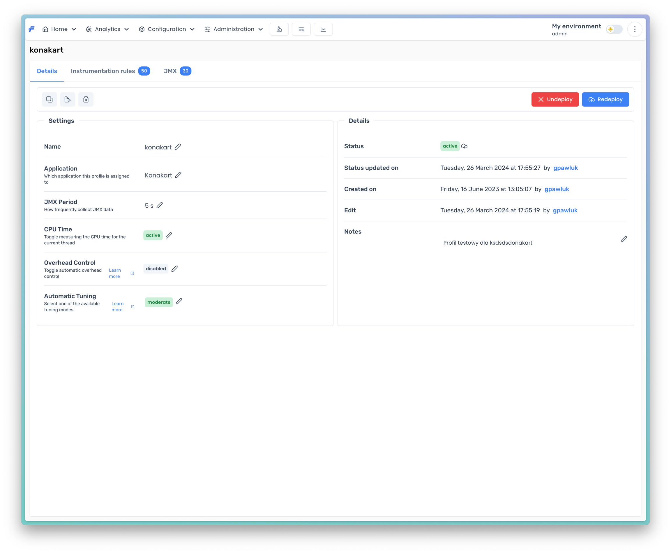 The profile details page contains a selected profile detailed information, such as its settings, instrumentation rules and JMX list of MBeans.