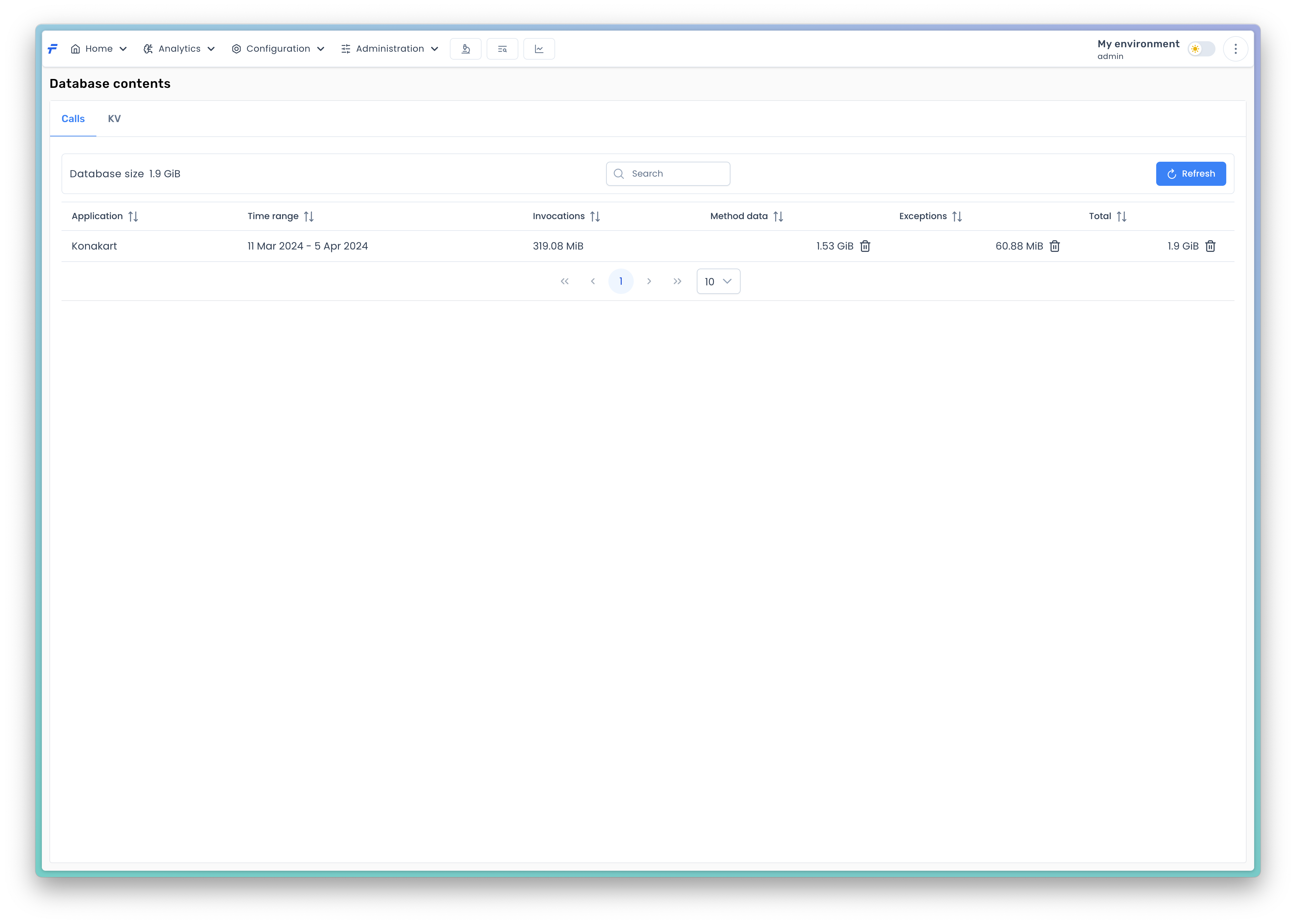 This view is a more fine-grained view of the data. It shows which application's data takes disk space most. The data are classified in logical groups. The <mark style="color:purple;">`Method Data`</mark> group contains methods' parameters and can be safely deleted if you are not interested in them. The <mark style="color:purple;">`Exceptions`</mark> group contains only exceptions stack traces and can also by safely deleted. You can also delete all data of the selected application by clicking the trash icon in the <mark style="color:purple;">`Total`</mark> column.&#x20;