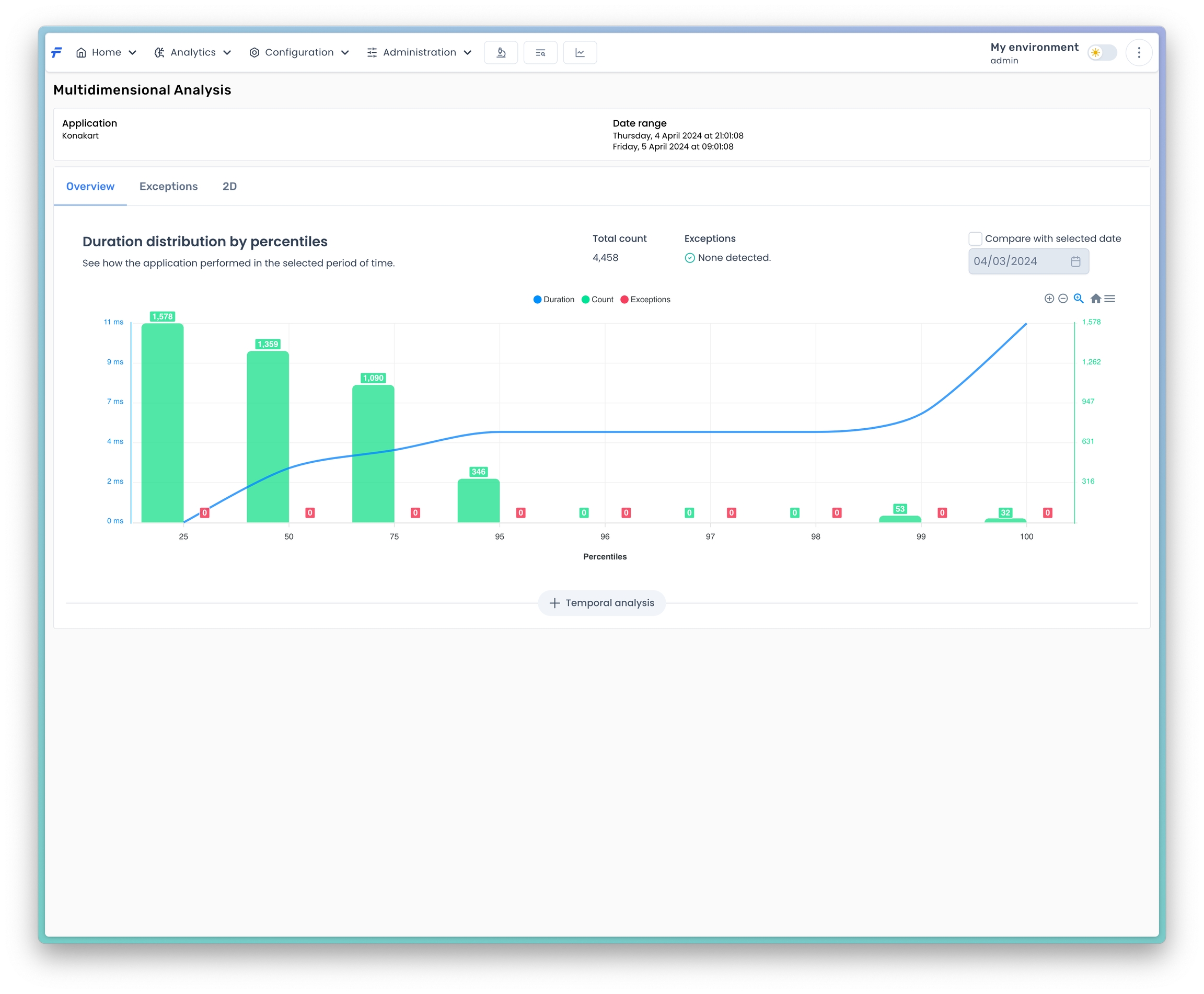 It is easy to see, in the sample case, that the number of methods invocations decreases rapidly as percentile grows. There are only a few outliers, whose duration is above a minute. It is up to a user whether a further analysis is required or not. If a more detailed investigation is needed a user can proceed with the analysis by pressing the Temporal analysis