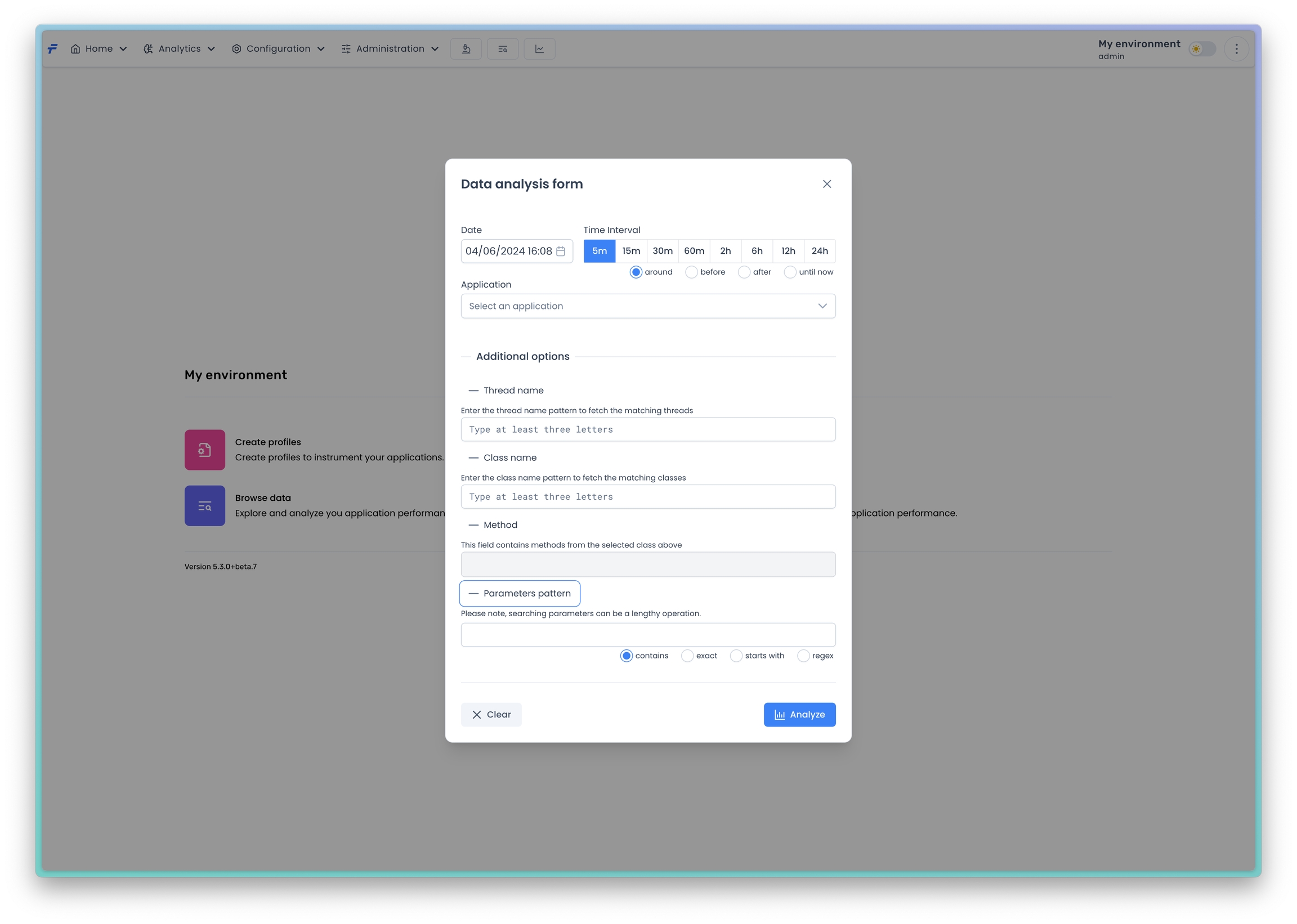 This view is useful when you want to analyze your collected method invocations. There are only two fields that need to be fill out. You must specify both the date range and the application. Then, the analysis will be performed for those method invocations which ended within the specified time range and came from the specified application.