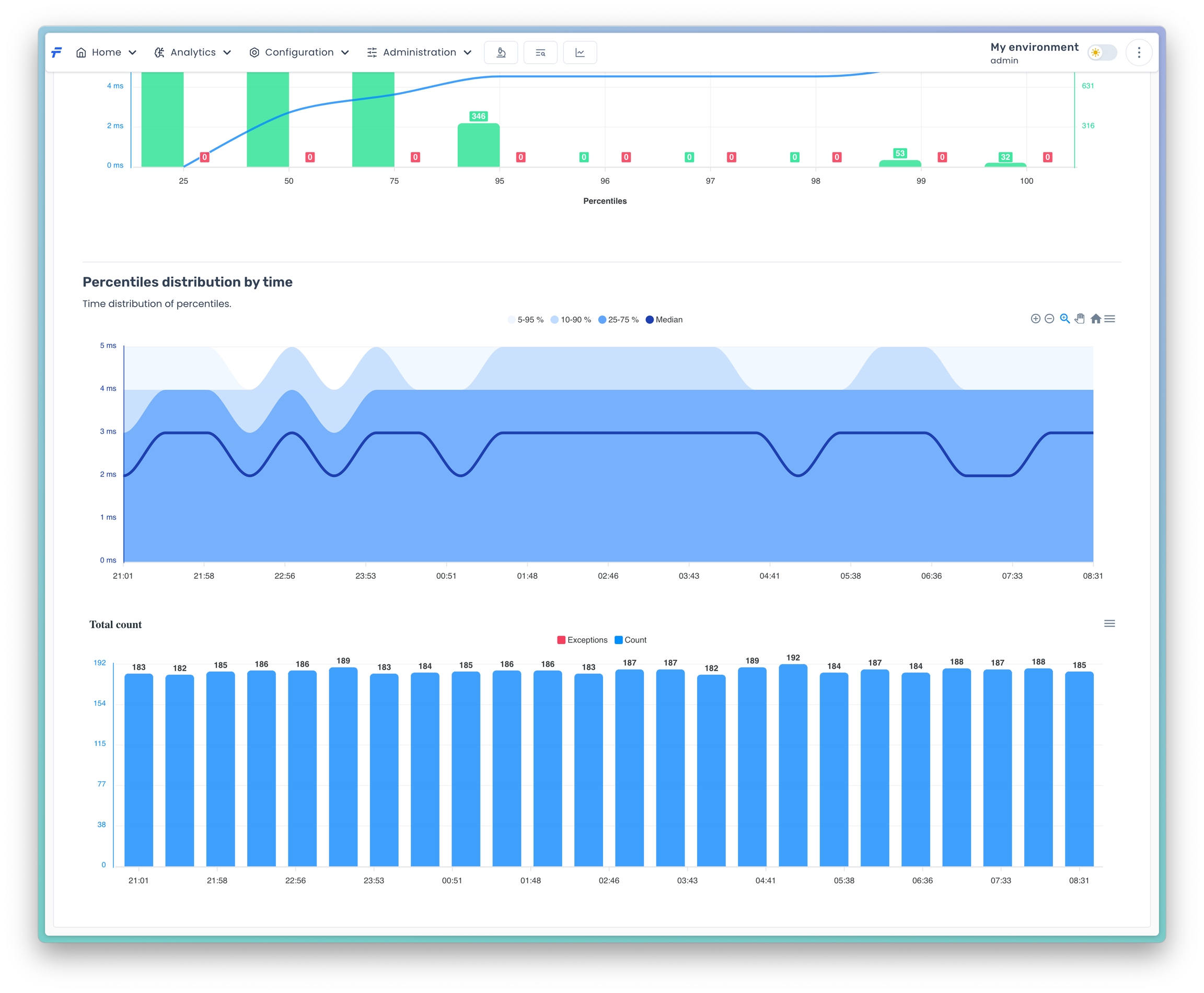 presents how the percentile values change in time. Just like in the duration distribution there are bars and curves. The bars represent the amounts of invocations in time periods. The curves present the percentile values of duration. There are four percentiles curves that can be displayed simultaneously, i.e. 25th, 50th, 75th and 9*th. The last one is customizable and can be changed in the Highest percentile