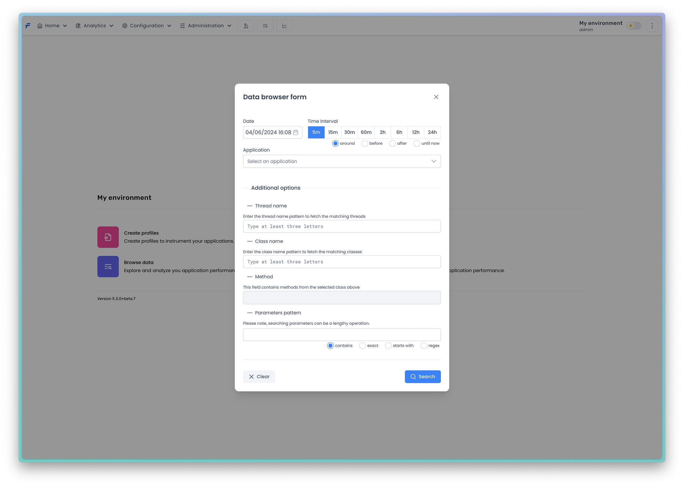 field. The specified value is a pattern to search for in methods invocations data. You need to select one of the four types: