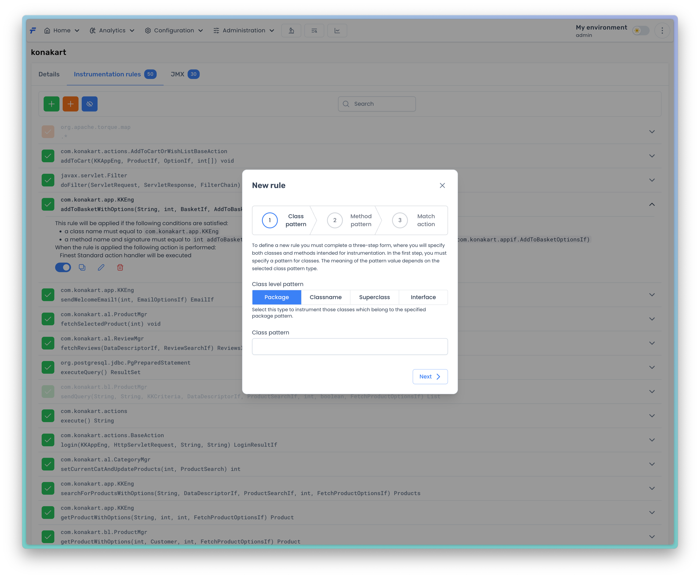 Inclusive rules are the ones that precisely define what classes and methods should be instrumented. To add such a rule, just press the Inclusive Rule button. A dialog window, with the rules wizard, should open then.