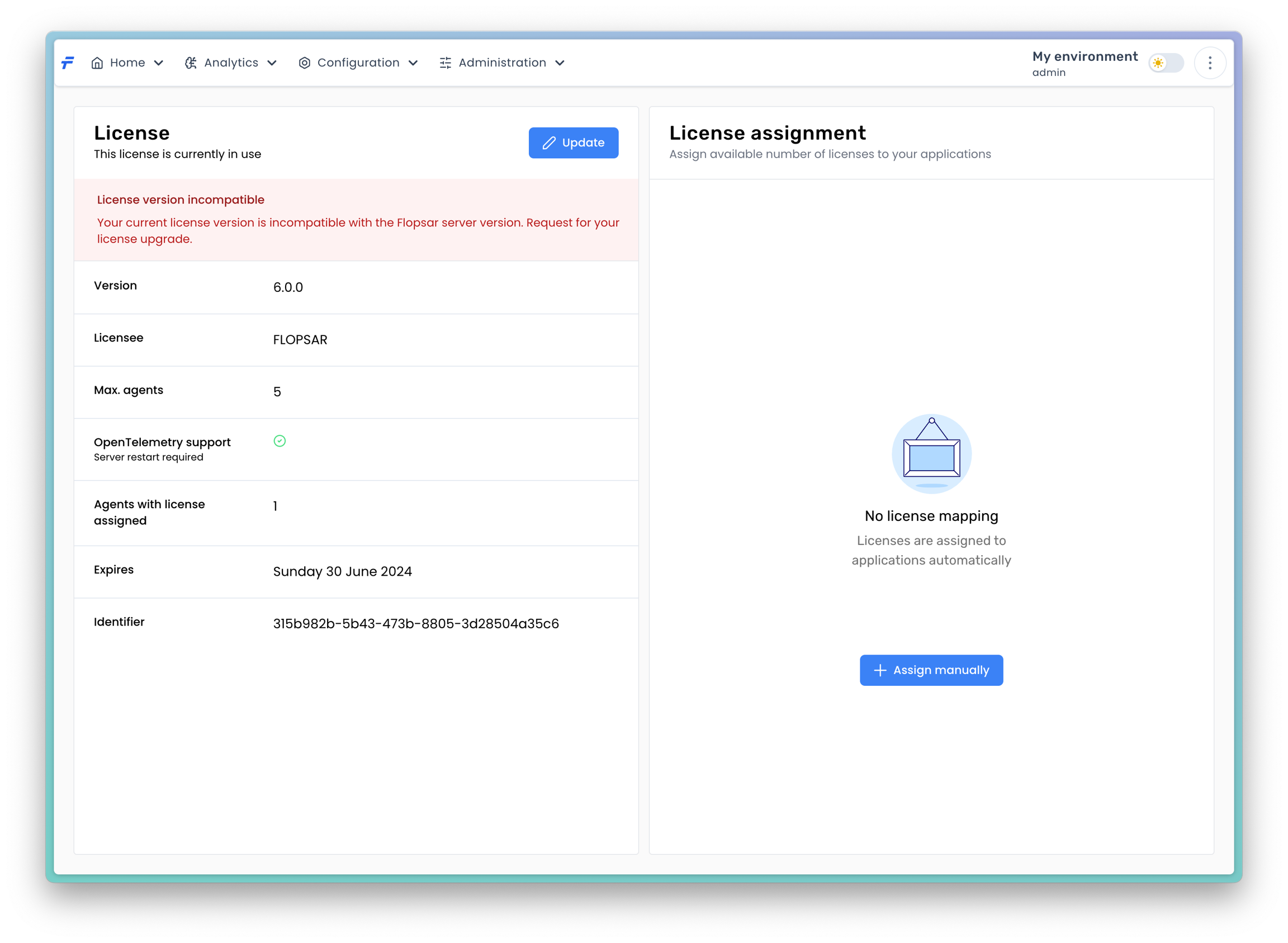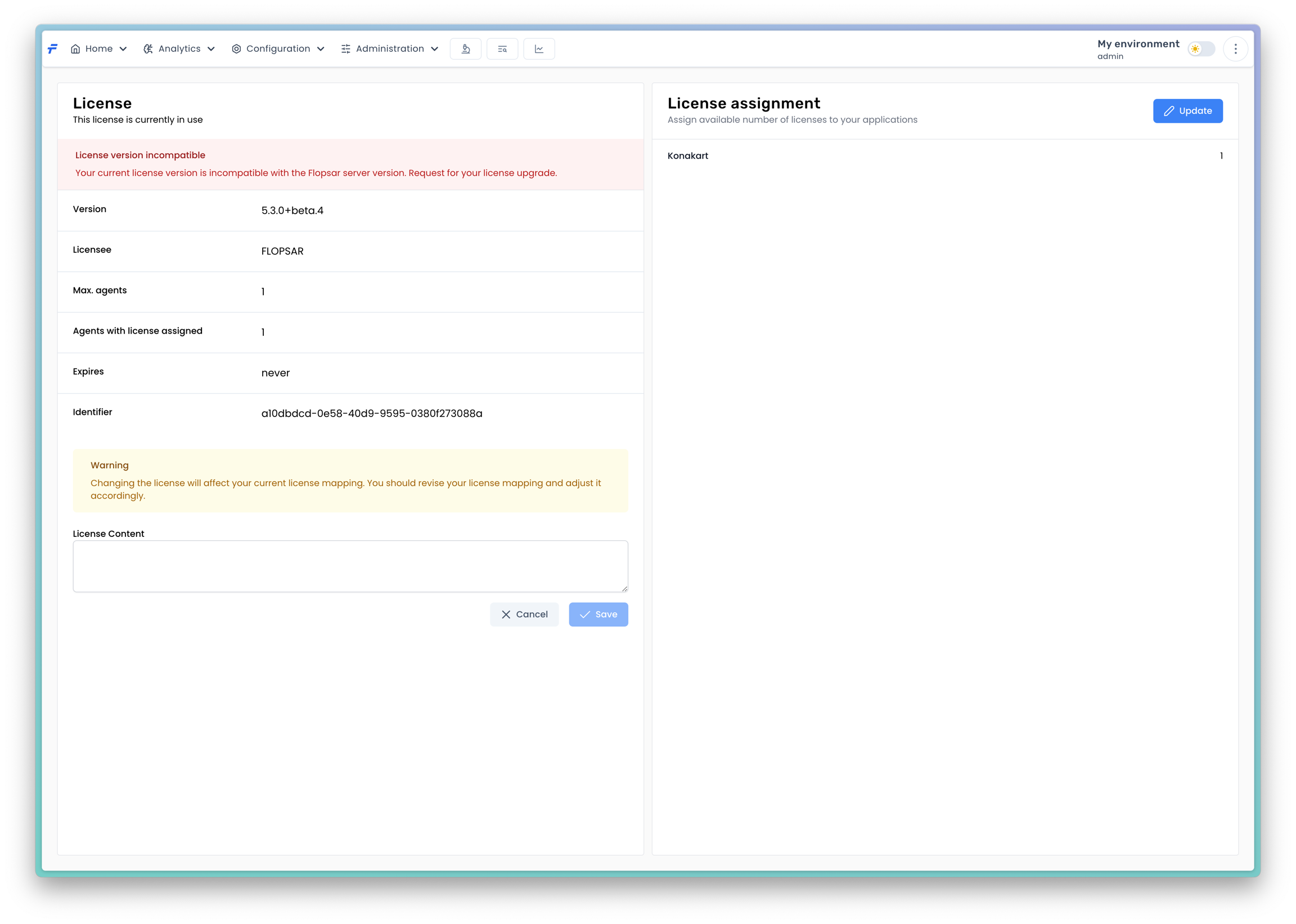 When you do not have a license, you can still run the Flopsar environment with some limitations. If you want to collect data from agents, you will need a valid license. This license must be uploaded to the server. You can do this from the License page.