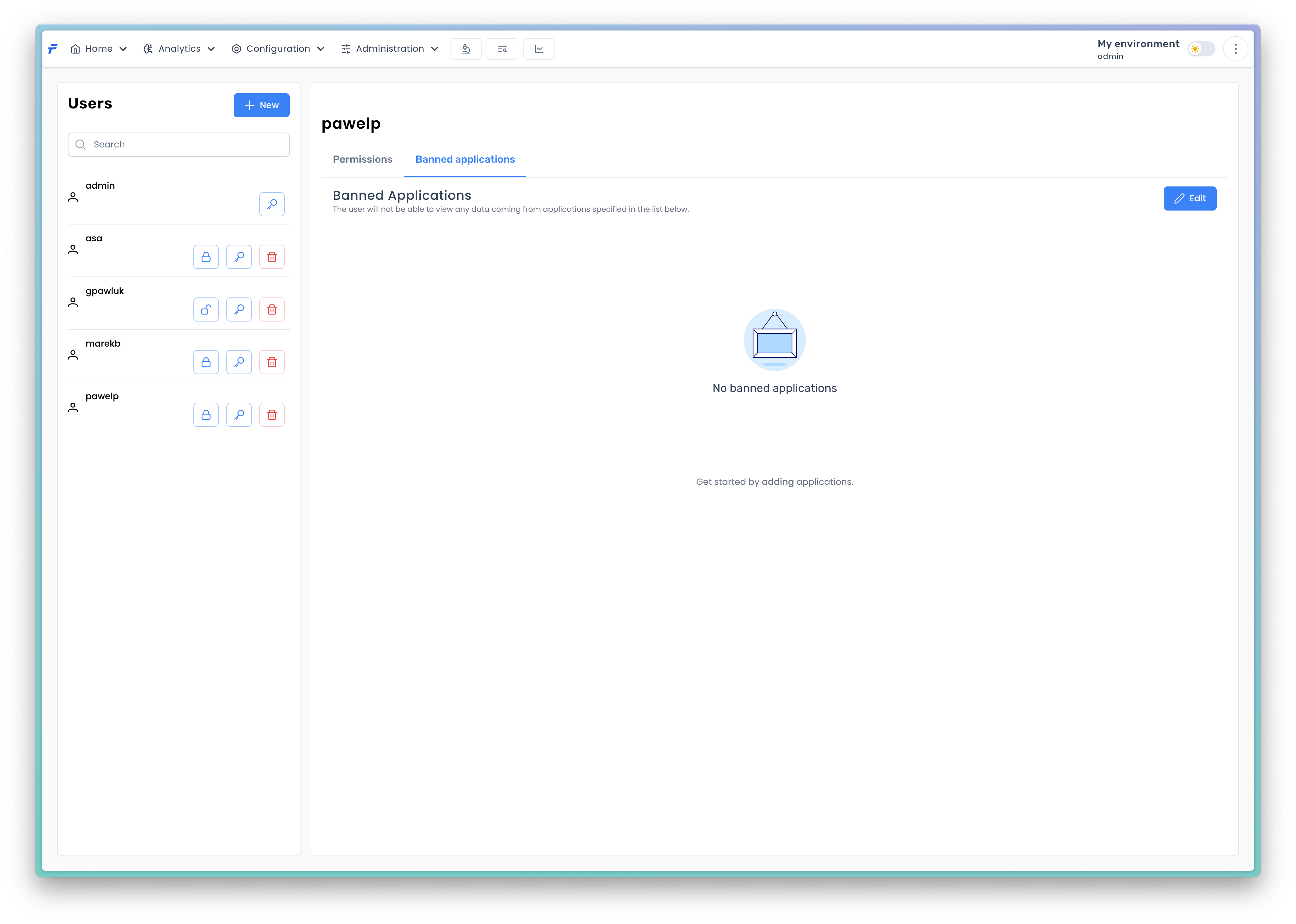 If you do not want a user to see data from particular applications, you can do this by banning the applications for that specific user. In order to edit the banned applications list click the <mark style="color:blue;">`Banned applications`</mark> tab.