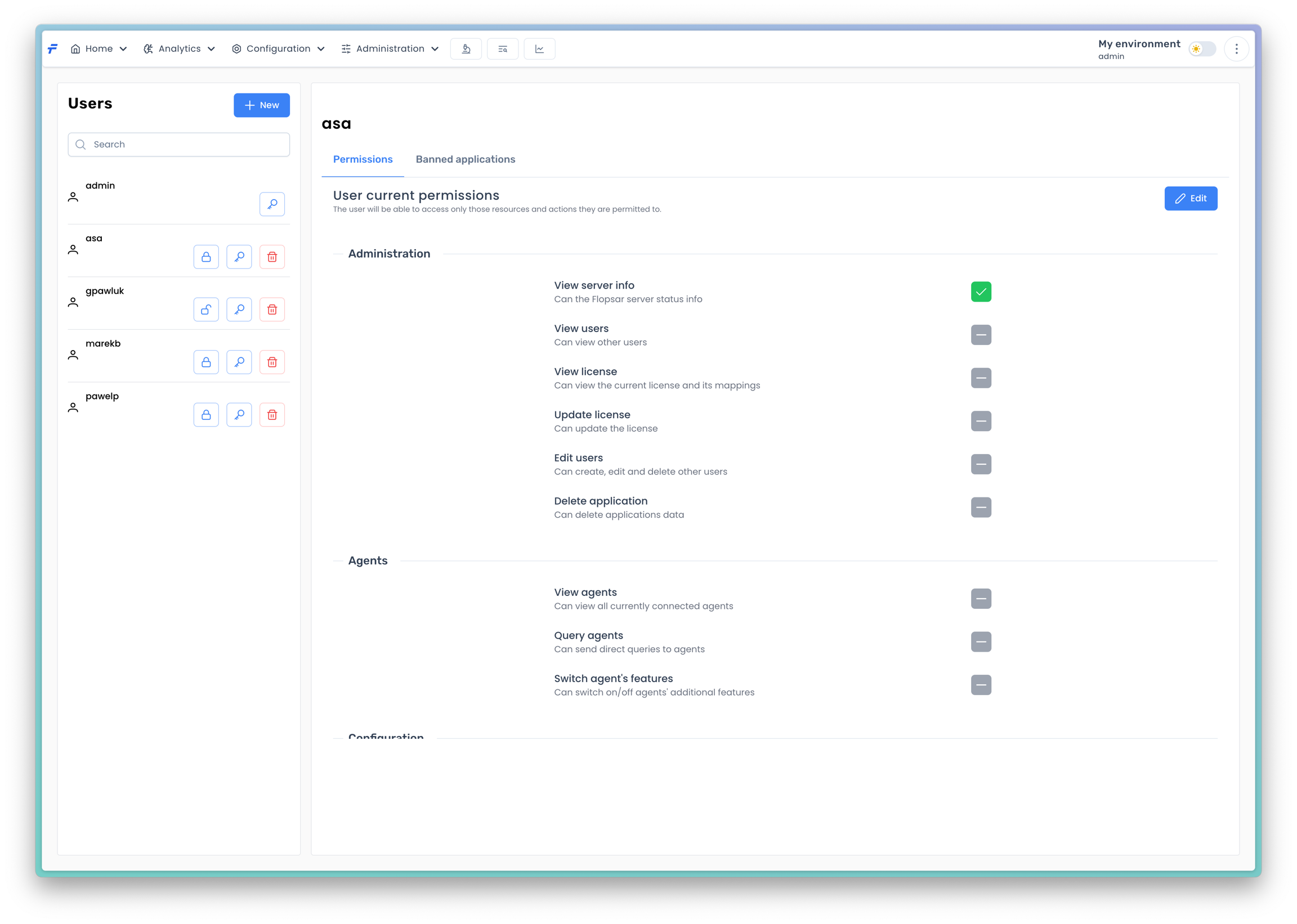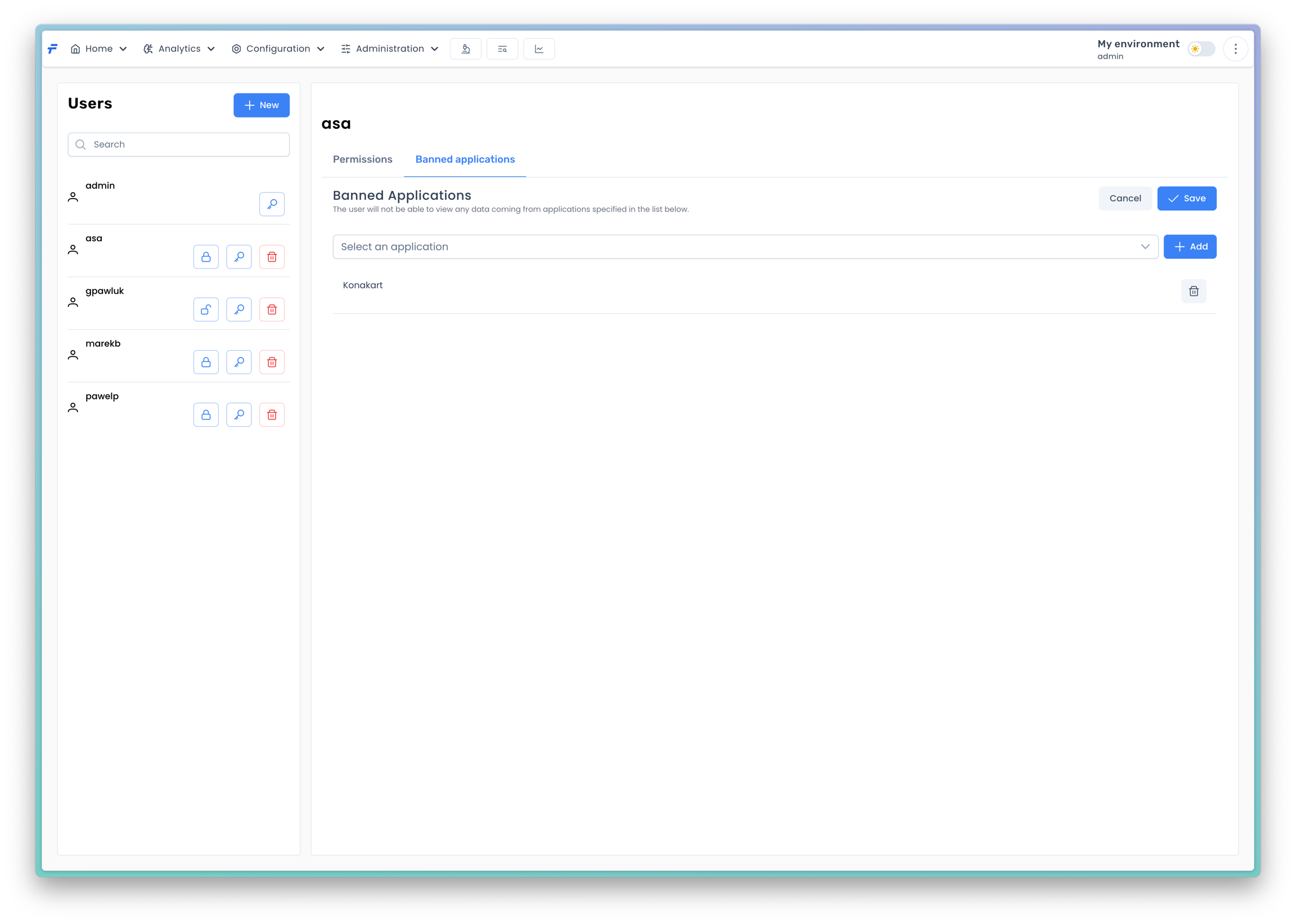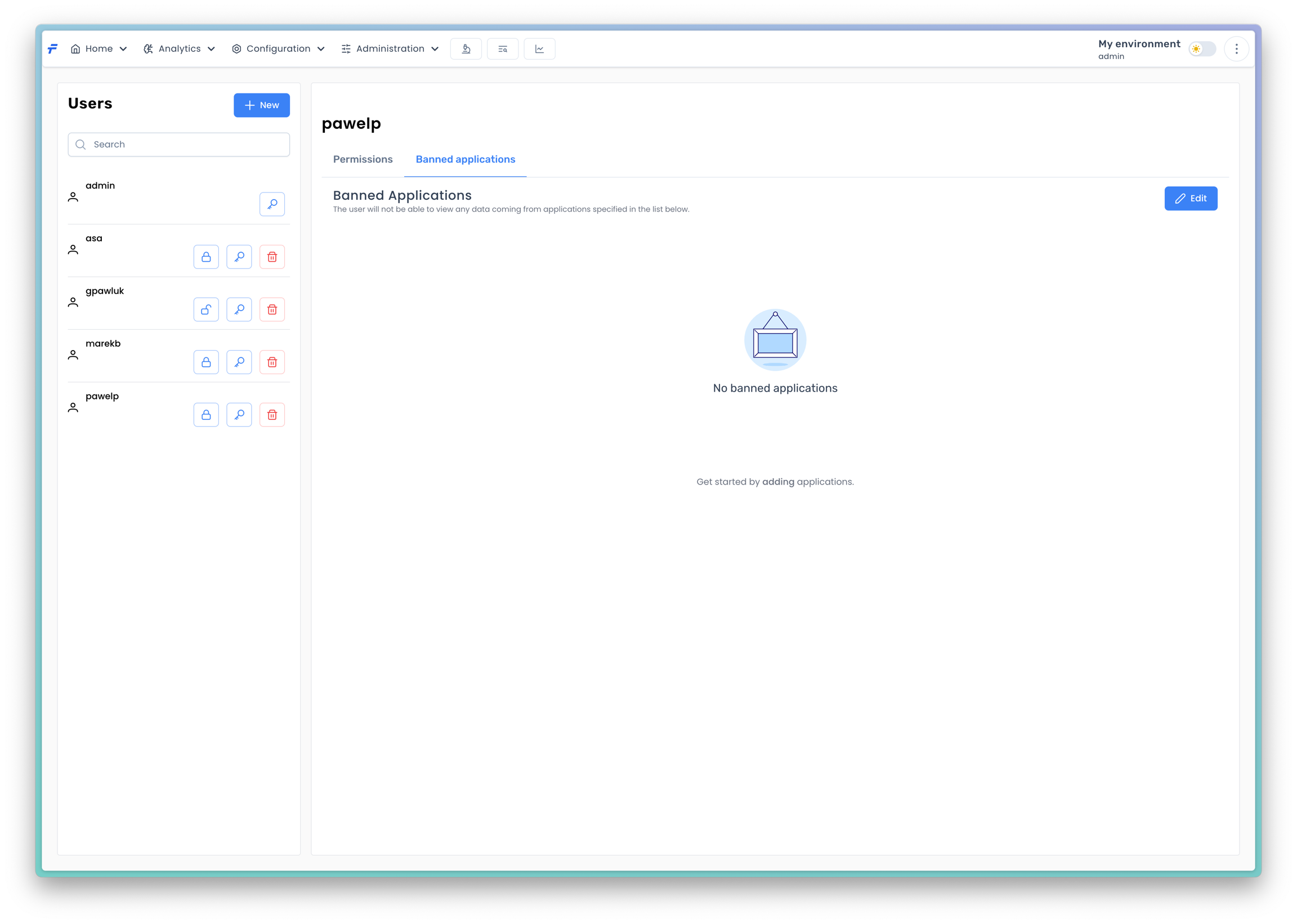 If you do not want a user to see data from particular applications, you can do this by banning the applications for that specific user. In order to edit the banned applications list click the Banned applications tab.