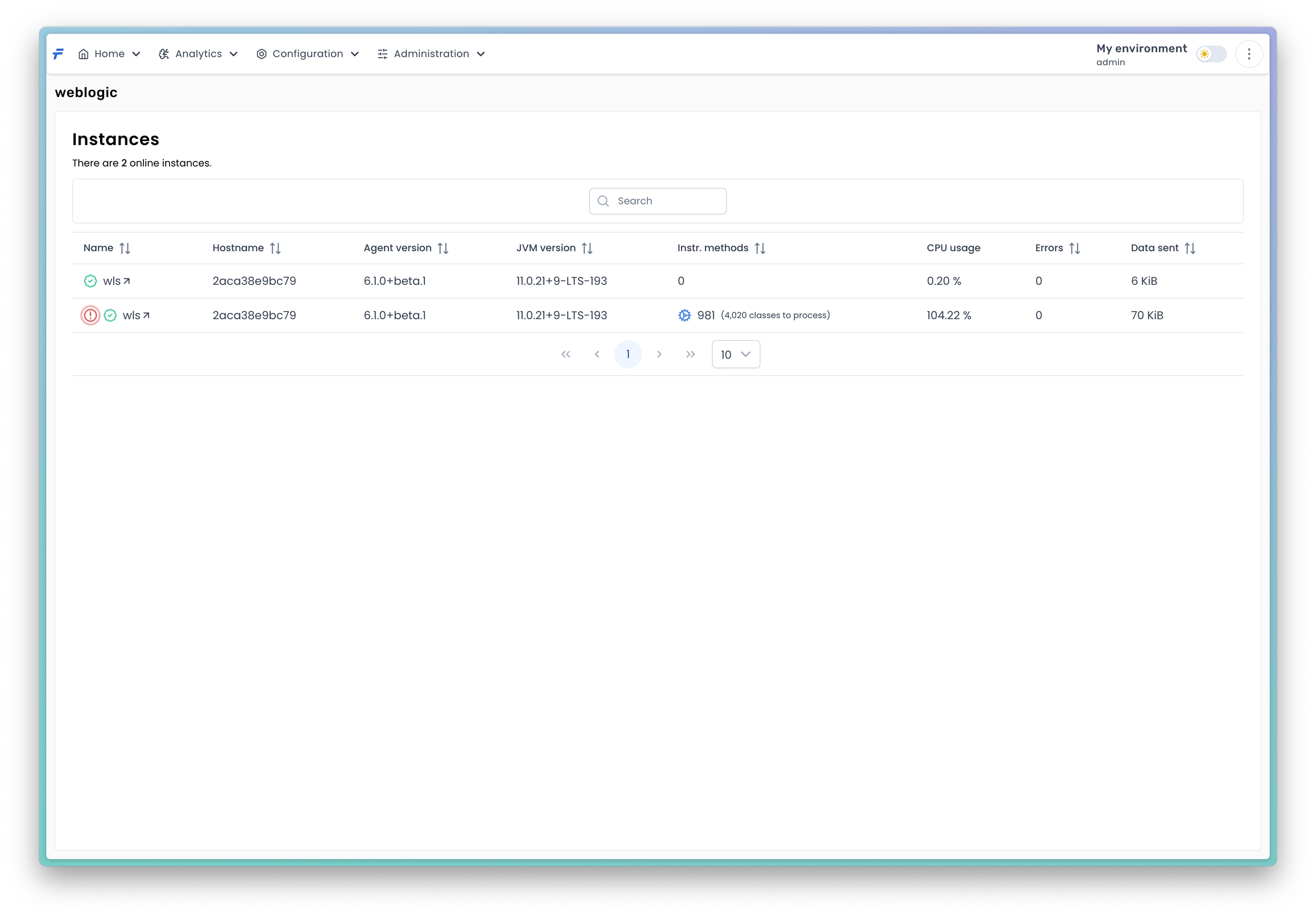 All the agents instances are presented in a table. All the table columns are self-explanatory. The first Name