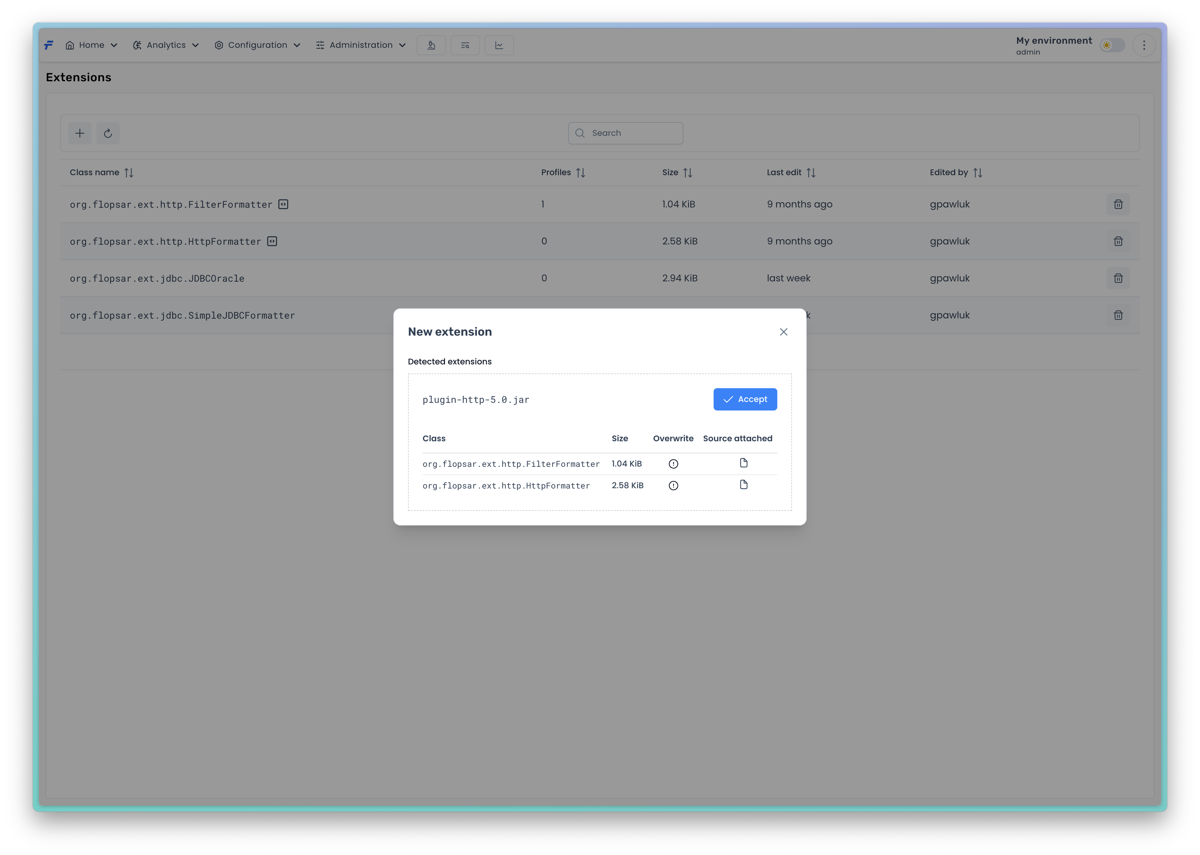 You can verify that the extensions you upload are the ones you wanted before you send them to the server. When a new extension class is already present in the server registry, you will see a red icon in the <mark style="color:purple;">`Overwrite`</mark> column. If the extension has its source code attached, you will see a green icon in the <mark style="color:purple;">`Source attached`</mark> column. If everything is fine, just press the <mark style="color:blue;">`Accept`</mark> button to upload the extensions.