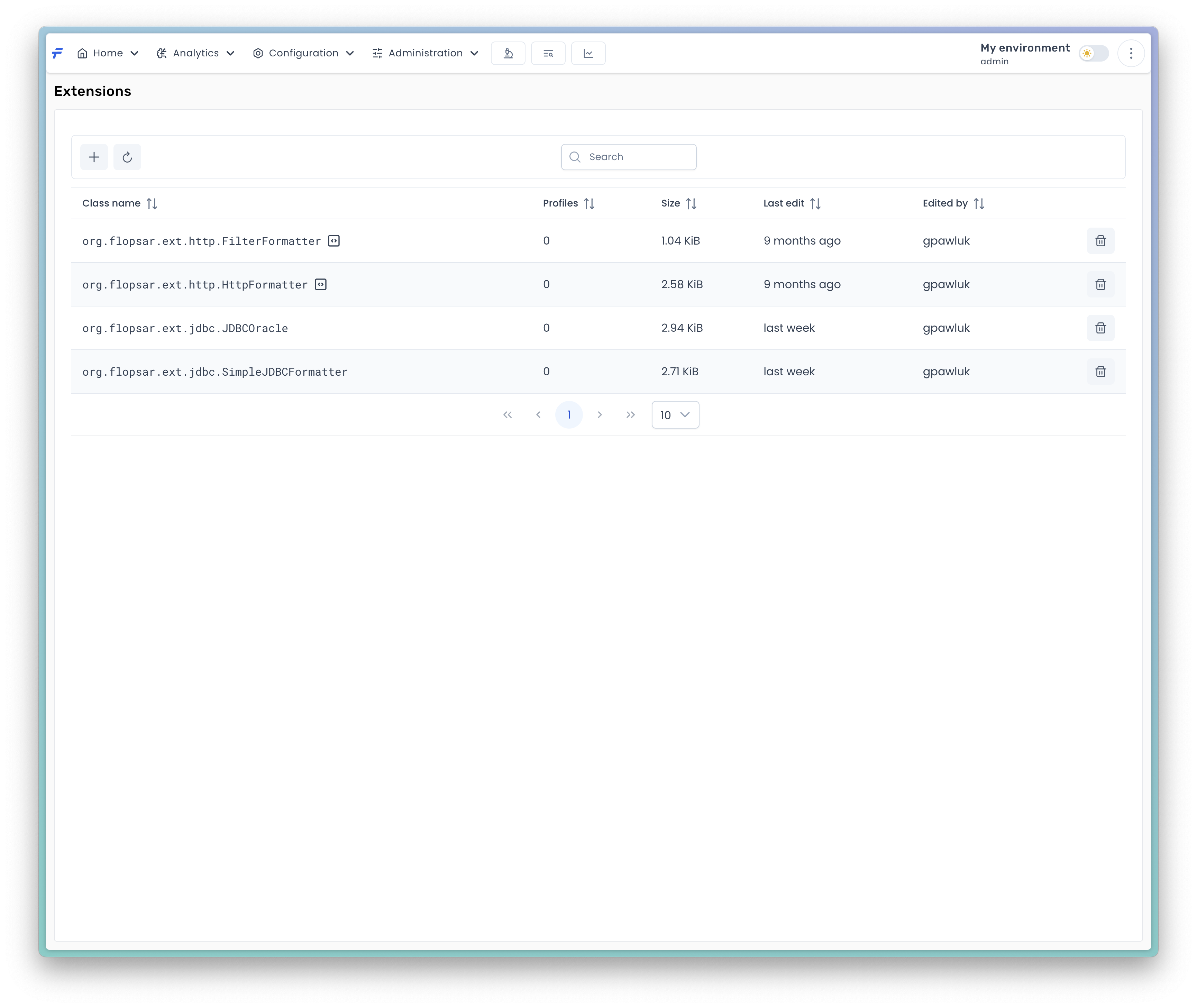 The <mark style="color:blue;">`Extensions`</mark> tab presents a list of all available extensions, stored in the server. If an extension has an icon next to its class name, it means there is a source code of this extension, which you can see by clicking this icon.&#x20;