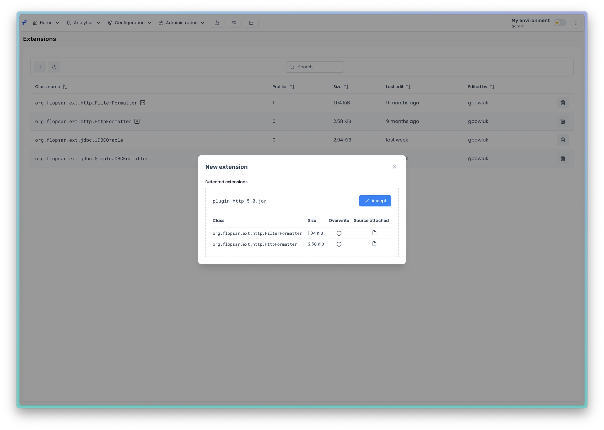 You can verify that the extensions you upload are the ones you wanted before you send them to the server. When a new extension class is already present in the server registry, you will see a red icon in the Overwrite column. If the extension has its source code attached, you will see a green icon in the Source attached column. If everything is fine, just press the Accept button to upload the extensions.