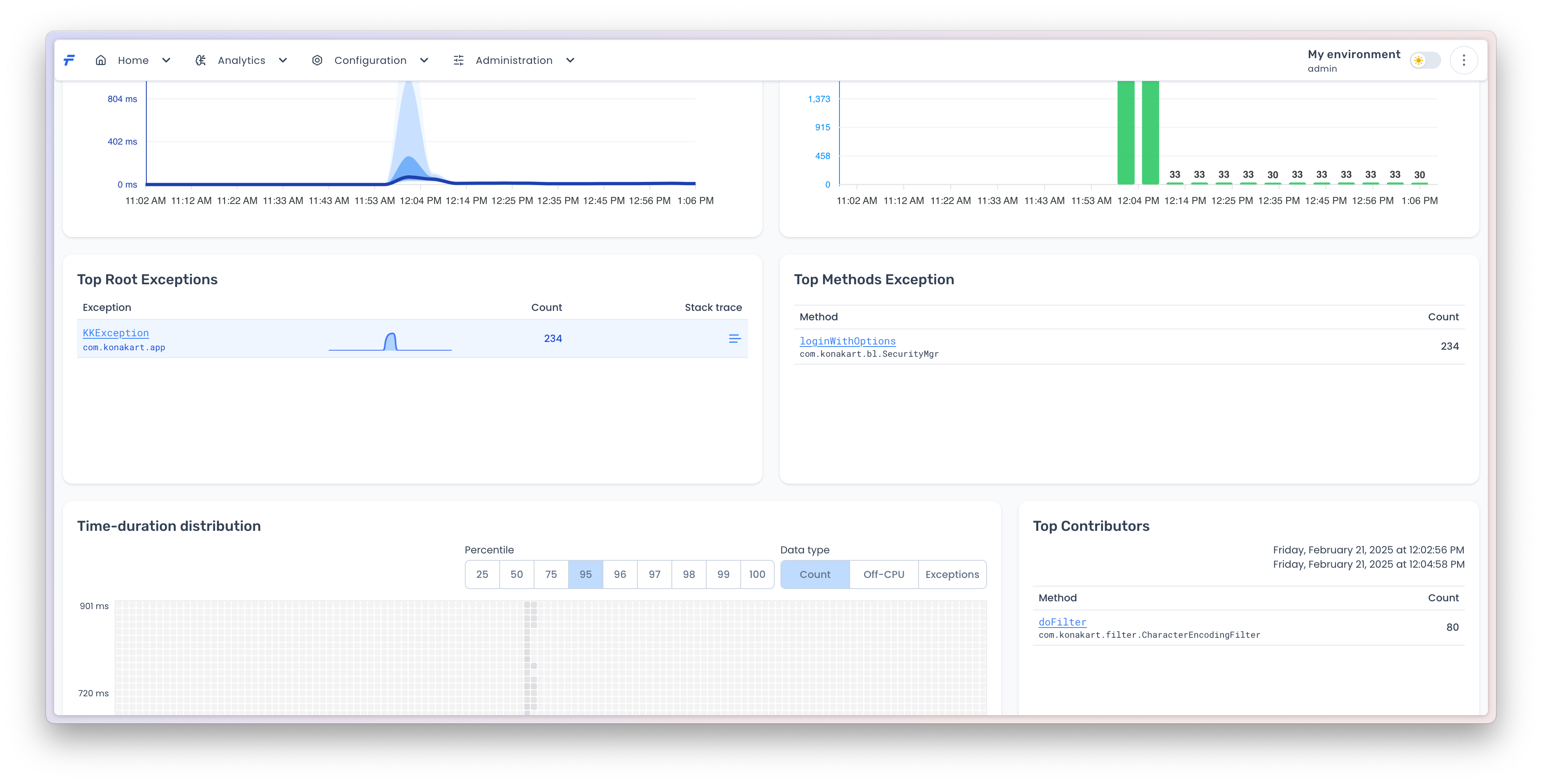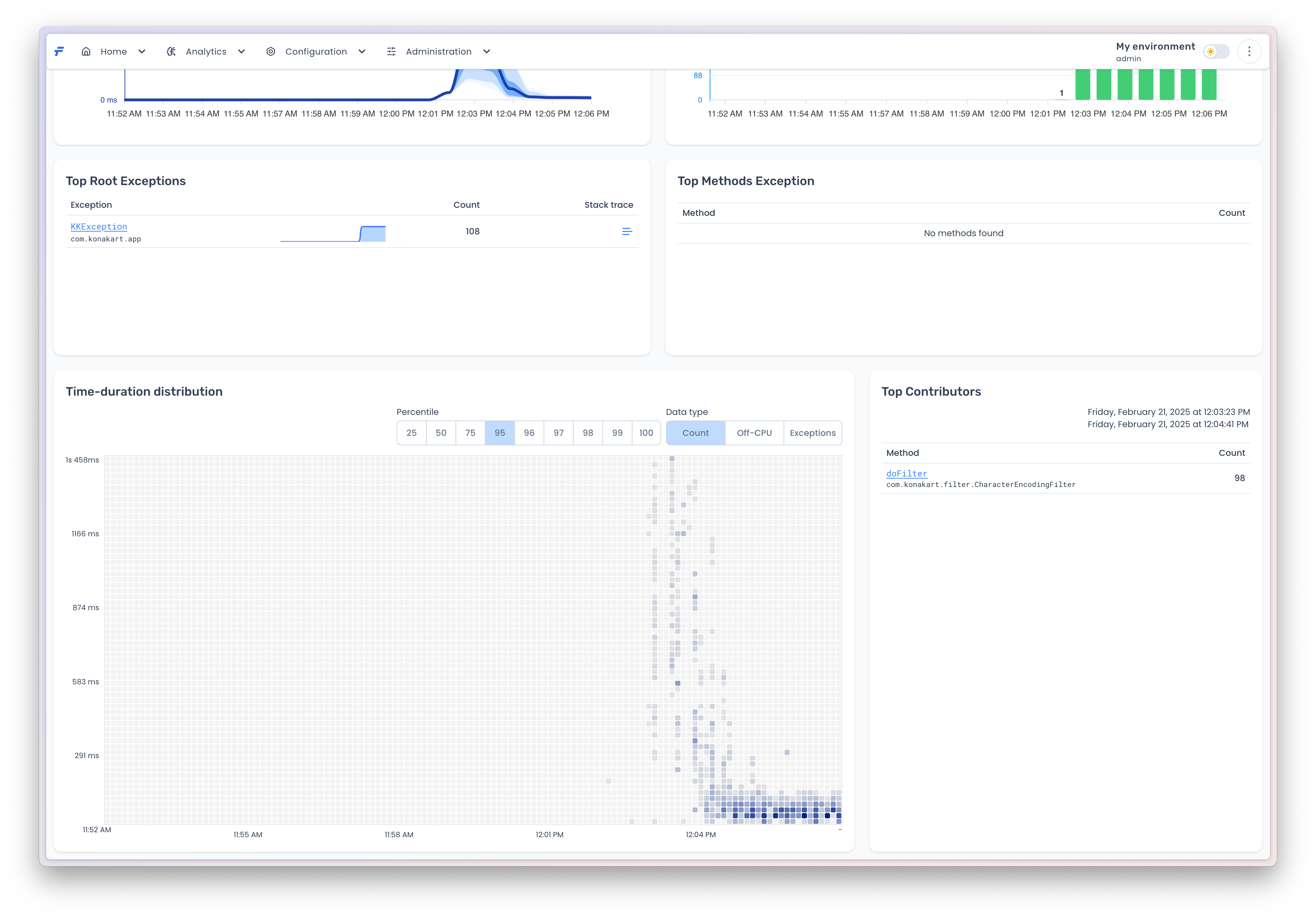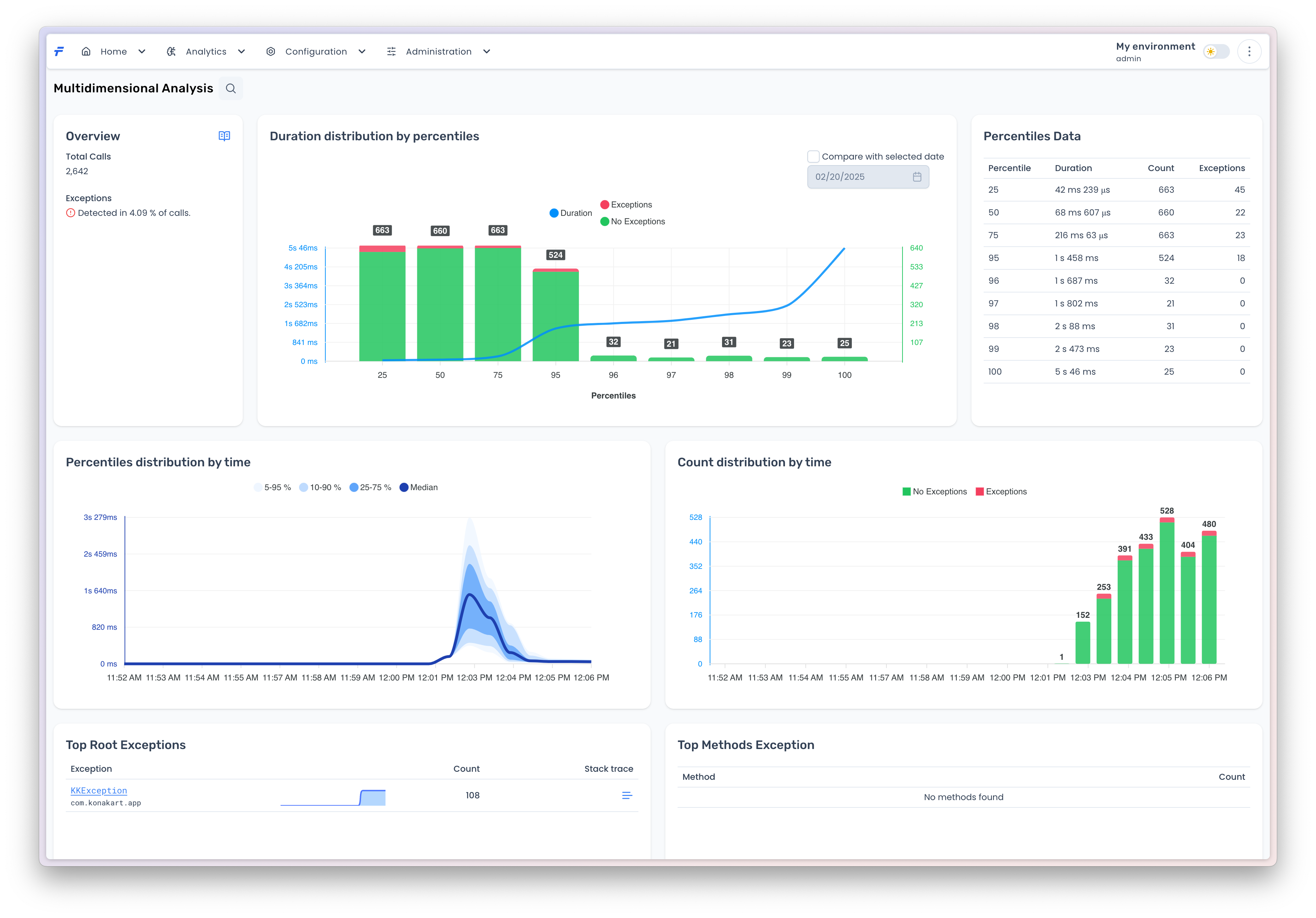 The analytics component encompasses three key areas: (1) [**percentile-based method invocation durations and call counts**](#duration-distribution), which provide statistical insights into method performance by measuring  distribution (e.g., P50, P90, P99) and total invocation frequency; (2) [**exception tracking**](#exceptions), capturing error types, stack traces, and exception rates to identify and diagnose system failures; and (3) [**two-dimensional duration vs time analysis**](#id-2d-analysis), correlating method invocation duration (start-to-end latency) with completion timestamps to detect temporal patterns, such as performance degradation during specific intervals or under varying load conditions. Together, these metrics enable comprehensive performance monitoring, root-cause analysis, and optimization of system behavior.
