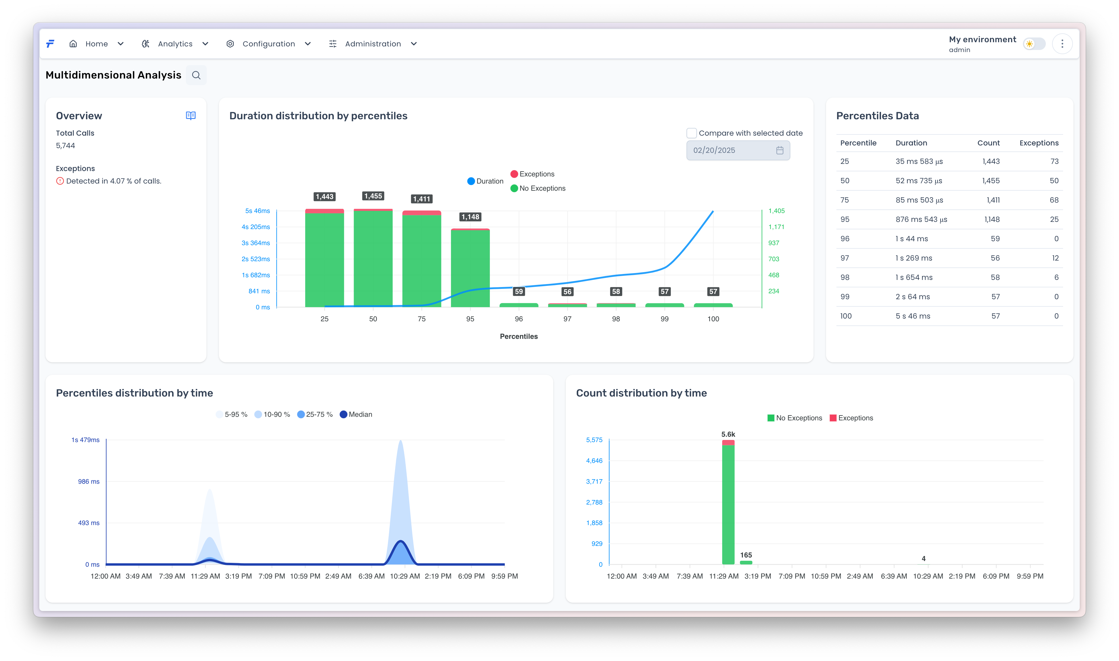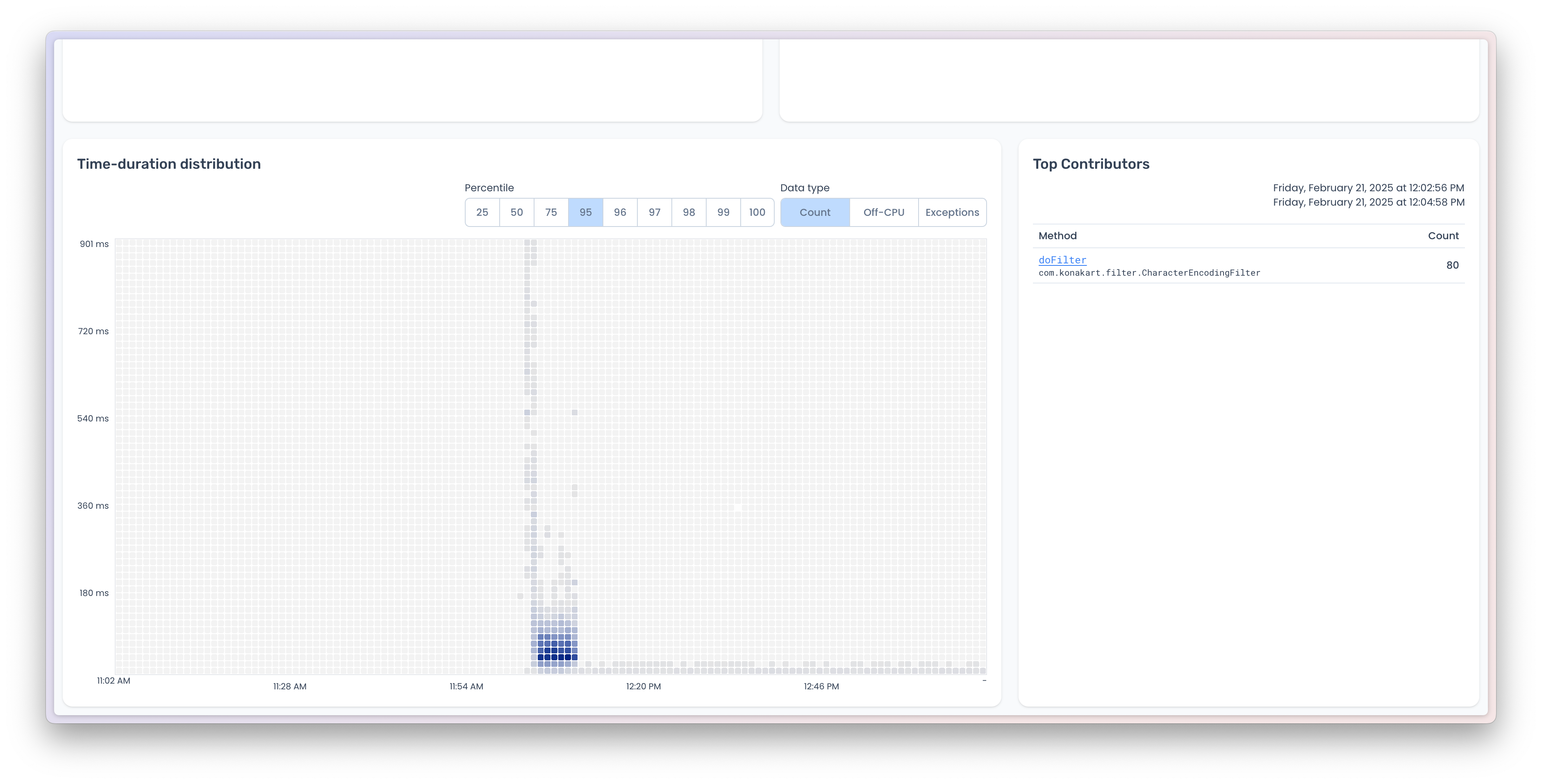 3. **Percentiles Distribution by Time**: A time-partitioned percentile plot that tracks method duration percentiles across temporal intervals, enabling identification of performance trends or anomalies over specific periods.