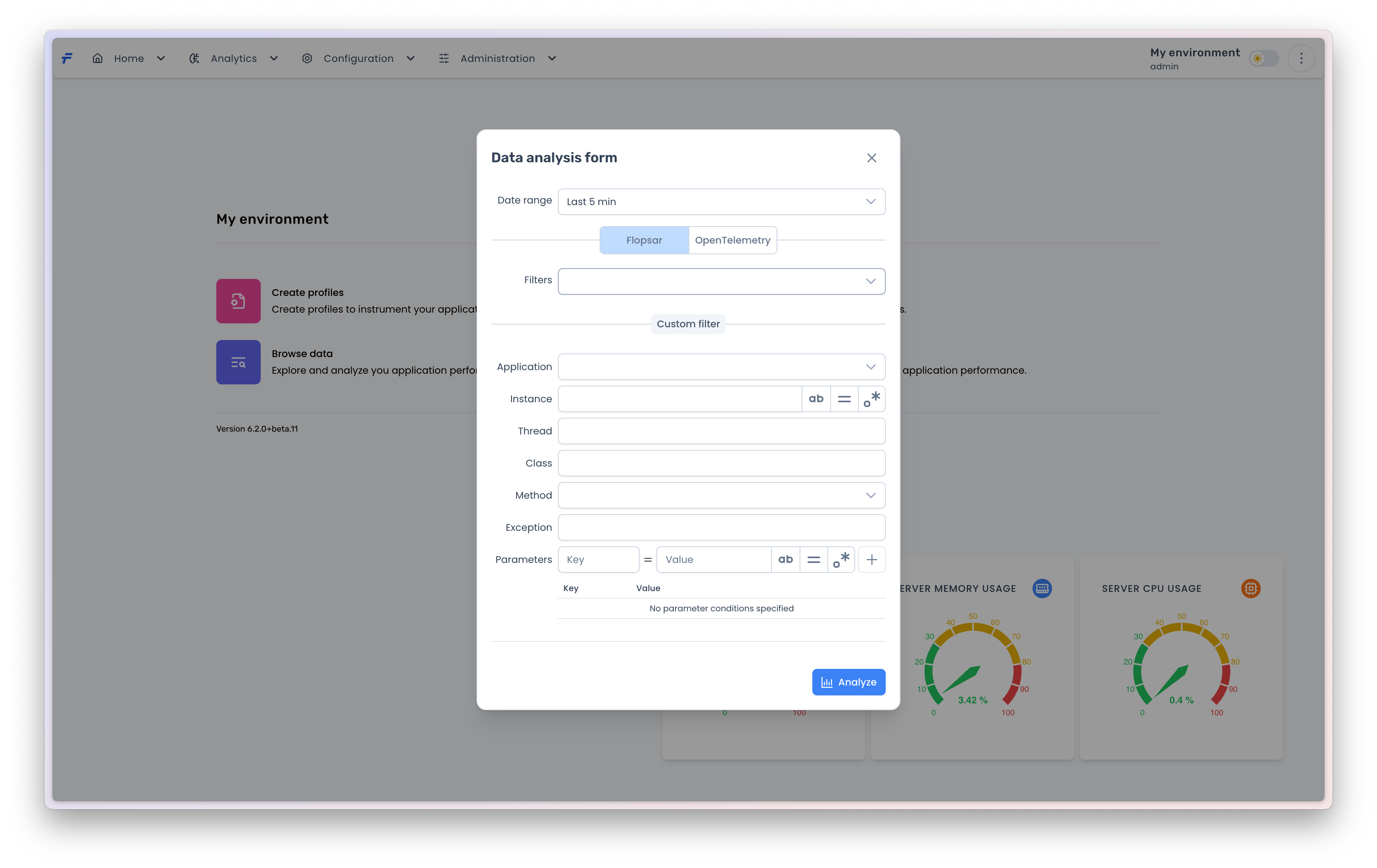This view is useful when you want to analyze your collected method invocations. There are only two fields that need to be fill out. You must specify both the date range and the application. Then, the analysis will be performed for those method invocations which ended within the specified time range and came from the specified application.&#x20;