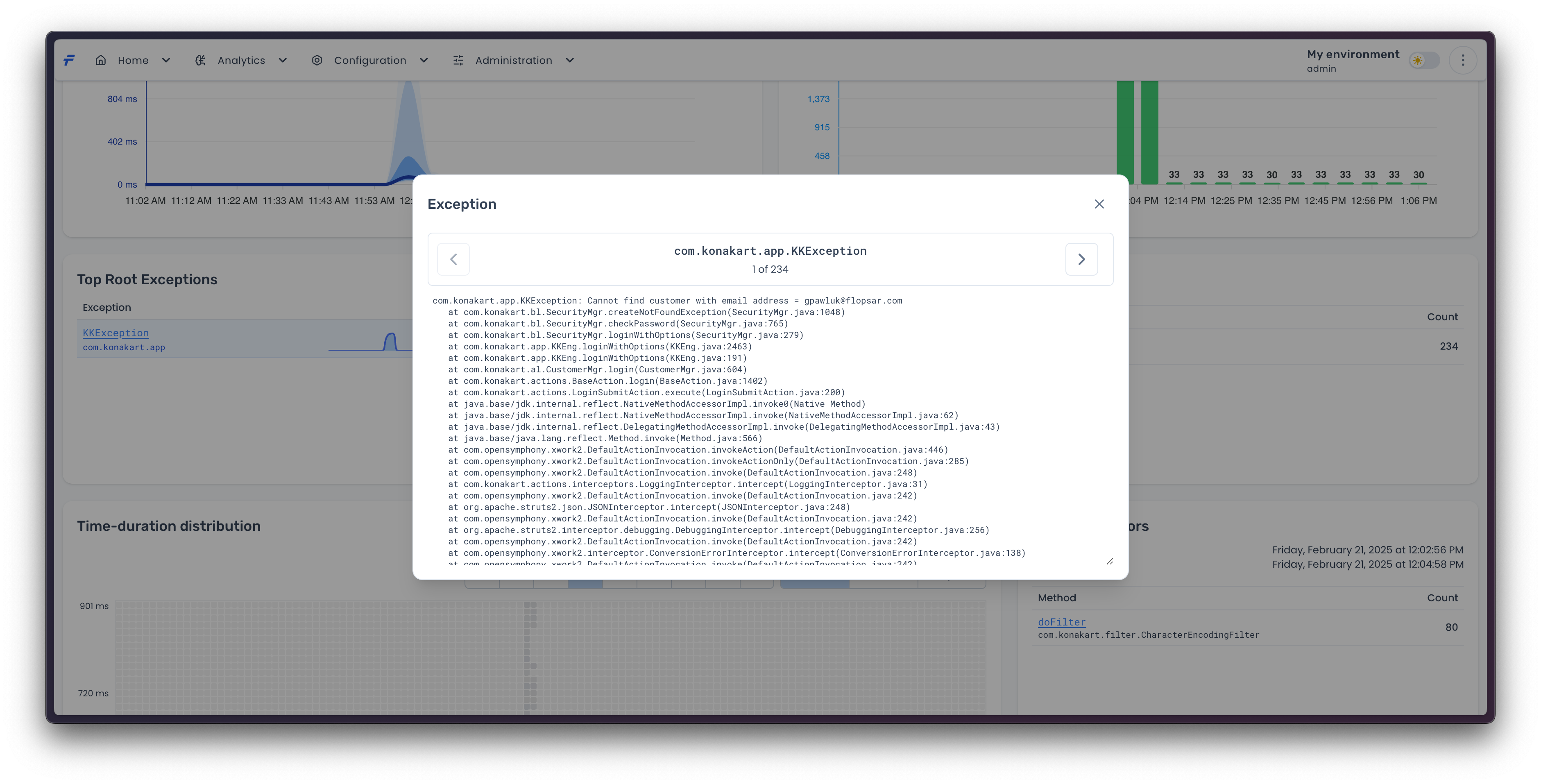 3. **Stack Trace Explorer**: The <mark style="color:blue;">`Stack Trace`</mark> column in the **Top Method Exception** table contains an icon. Clicking this icon opens a modal window that allows users to browse successive stack traces associated with the chosen exception, enabling granular root-cause analysis. The interface supports navigation through multiple stack trace instances (e.g., via pagination or scrolling) to inspect contextual execution paths.<br>
