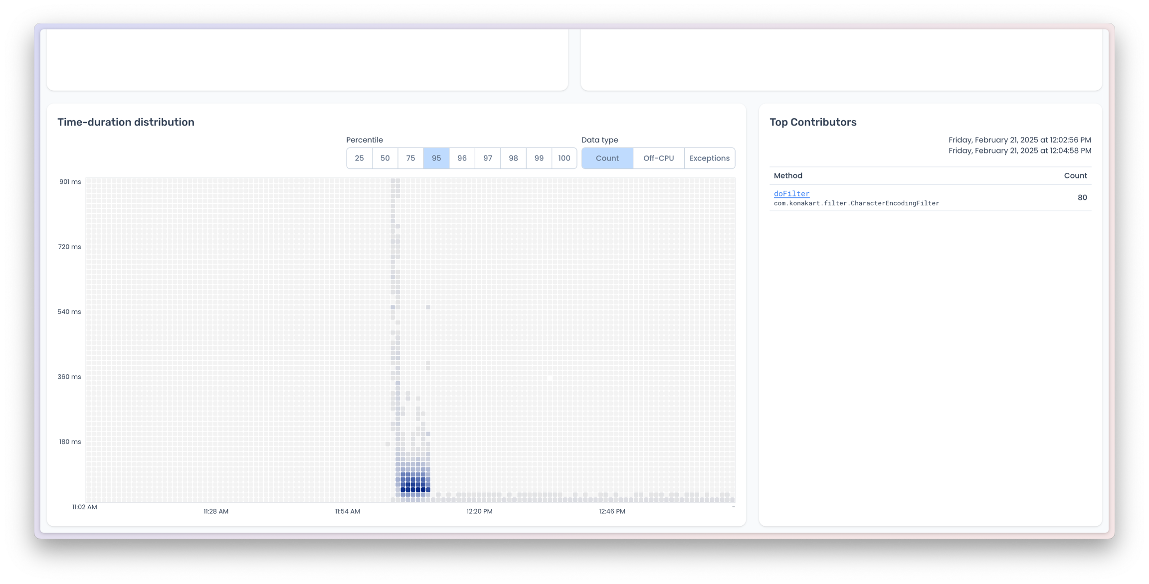 Percentiles Distribution by Time: A time-partitioned percentile plot that tracks method duration percentiles across temporal intervals, enabling identification of performance trends or anomalies over specific periods.