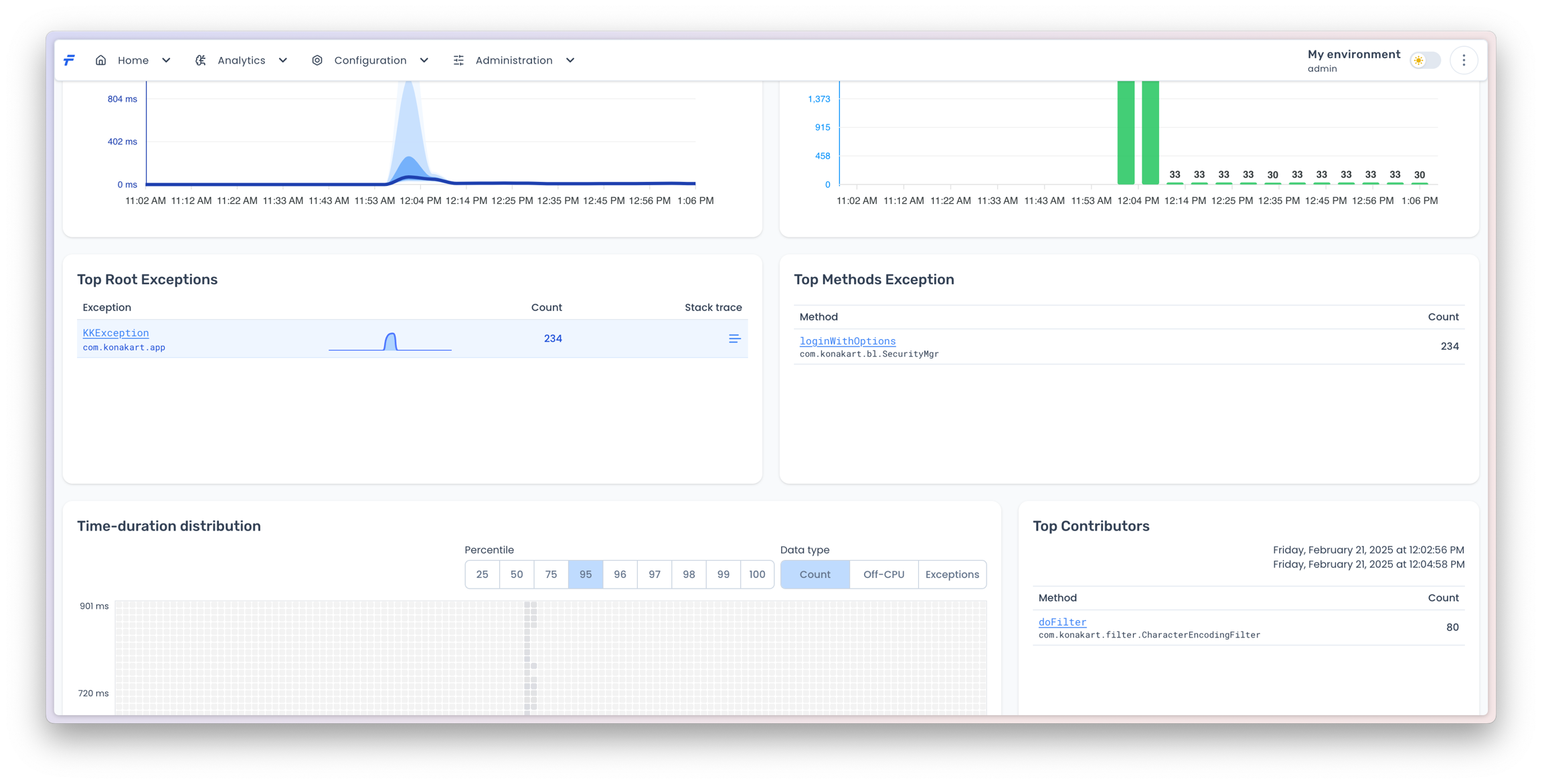 The analytics component encompasses three key areas: (1) percentile-based method invocation durations and call counts, which provide statistical insights into method performance by measuring distribution (e.g., P50, P90, P99) and total invocation frequency; (2) exception tracking, capturing error types, stack traces, and exception rates to identify and diagnose system failures; and (3) two-dimensional duration vs time analysis, correlating method invocation duration (start-to-end latency) with completion timestamps to detect temporal patterns, such as performance degradation during specific intervals or under varying load conditions. Together, these metrics enable comprehensive performance monitoring, root-cause analysis, and optimization of system behavior.