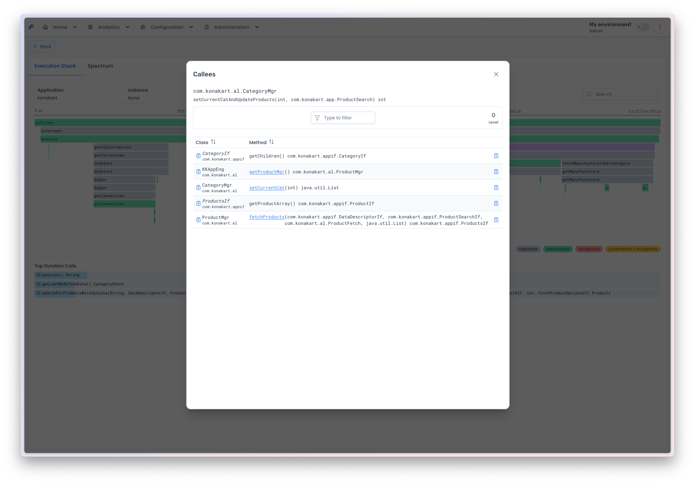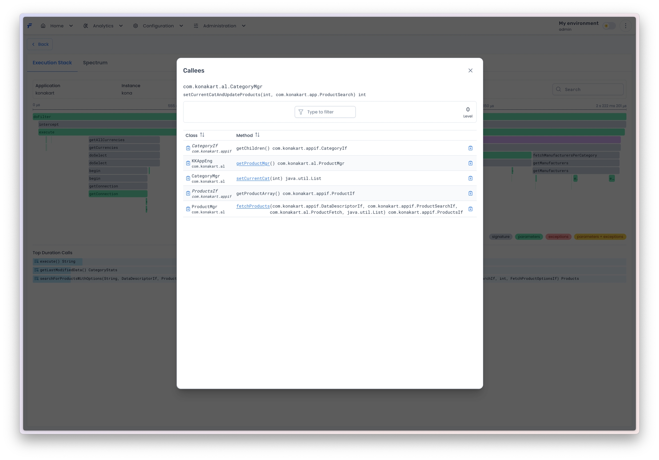 The search results are presented in a form of a table. Each table record presents a single method invocation. If you want to see more details about the selected method invocation, just click the method signature and you will get details of the execution stack this method is a member of.