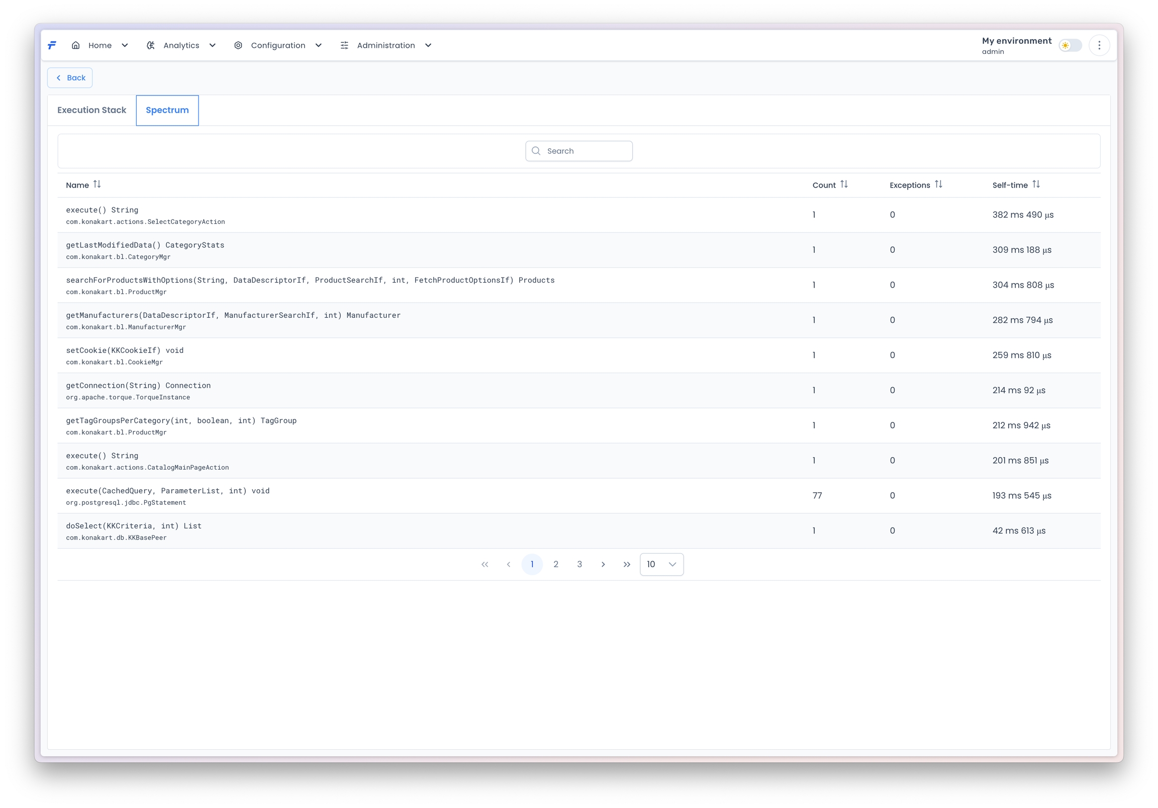 This view presents a list of all methods called within the execution stack. The methods are aggregated and sorted. You can sort them with respect to one of the three criteria: self time, calls count and exceptions count.