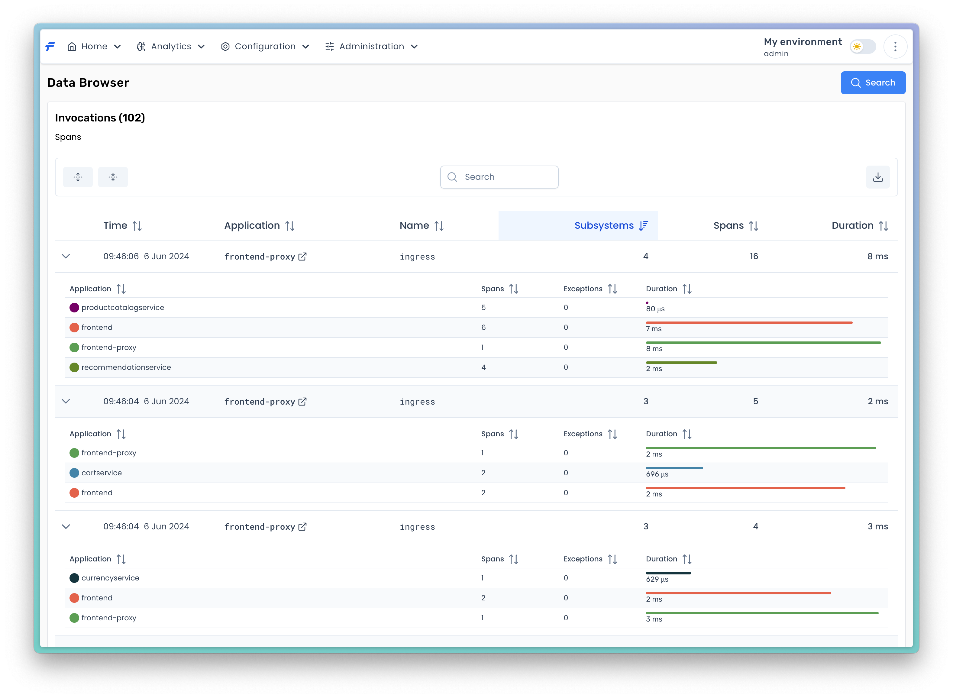 When you expand the selected trace, you can see a more detailed view of its subsystems. The subsystems table contains the following data: