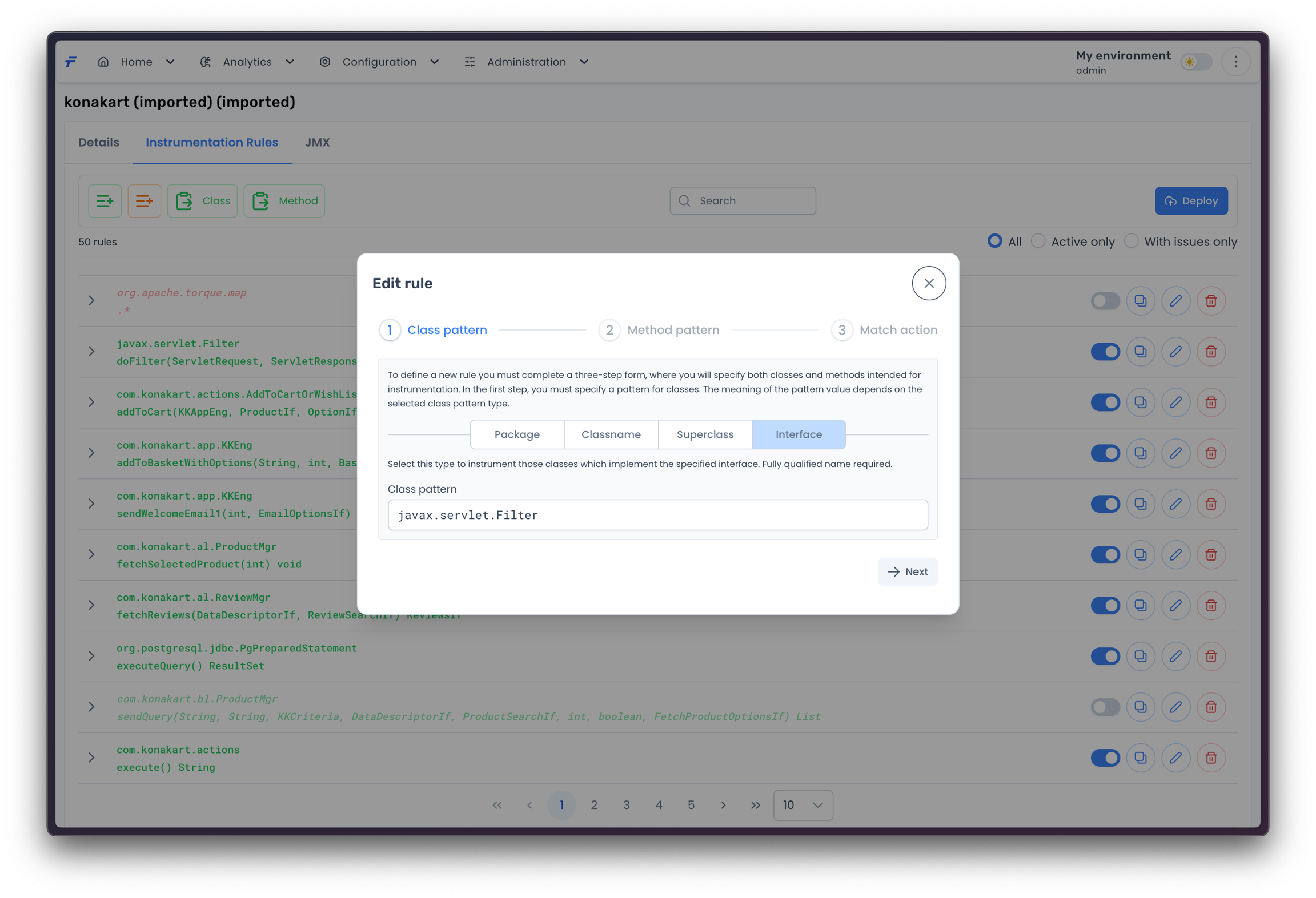 Inclusive rules are the ones that precisely define what classes and methods should be instrumented. To add such a rule, just press the Inclusive Rule button. A dialog window, with the rules wizard, should open then.